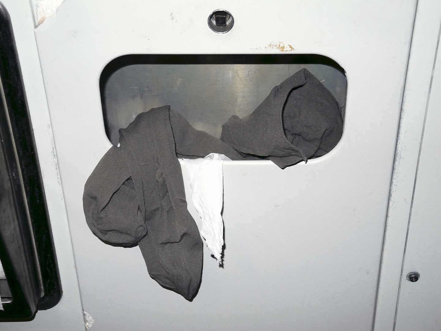 Strumpfhose im Abfallbehälter.