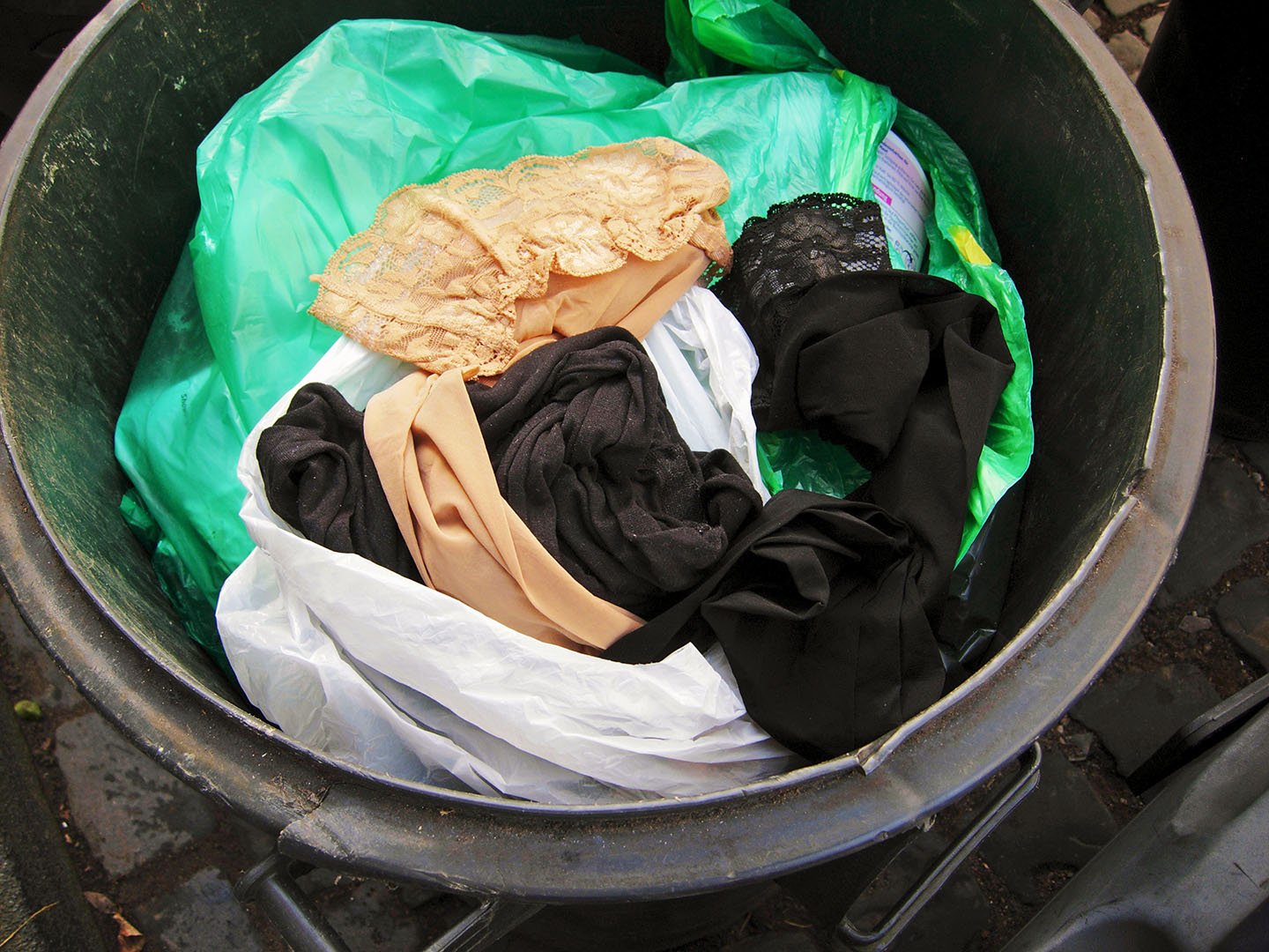 Spontanentsorgung einer Feinstrumpfhose im Restmüllcontainer.