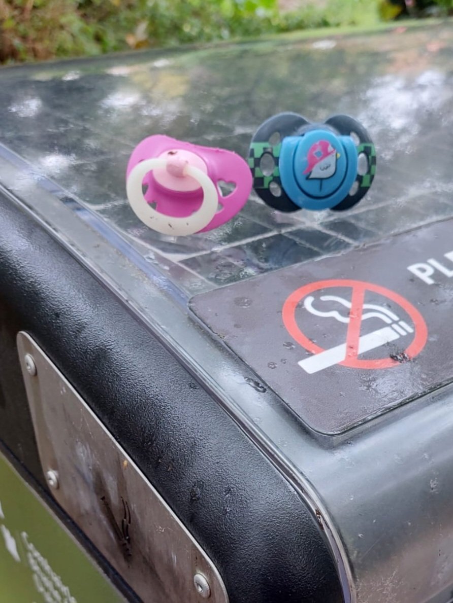 Hab dann am nächsten Tag noch einen anderen schnuller gefunden, der ganz knapp an einer Kante hinter einem Zaun lag und ins Gestrüpp zu fallen drohte