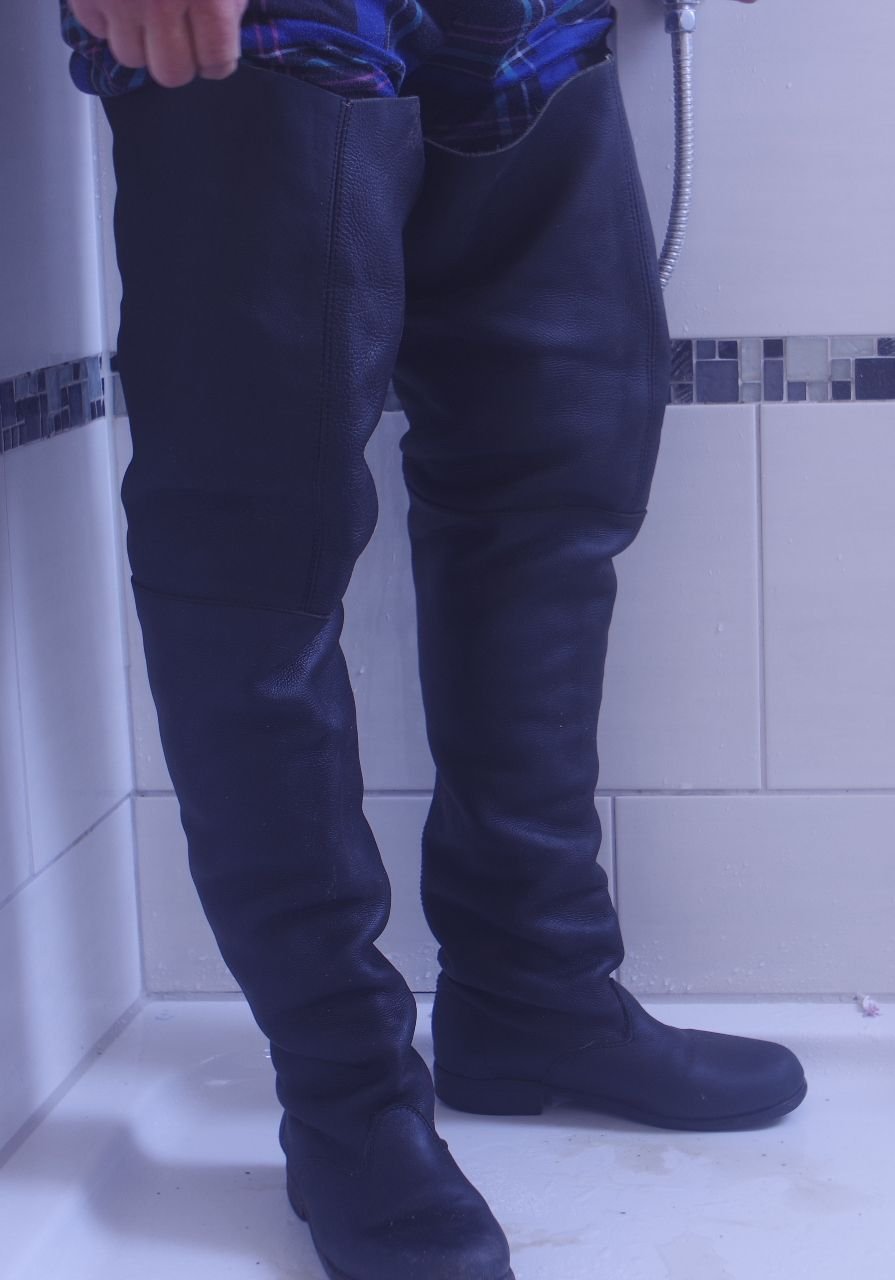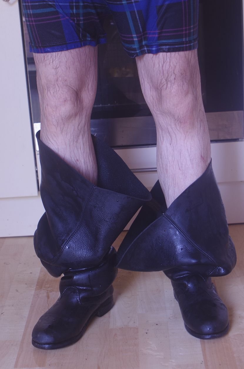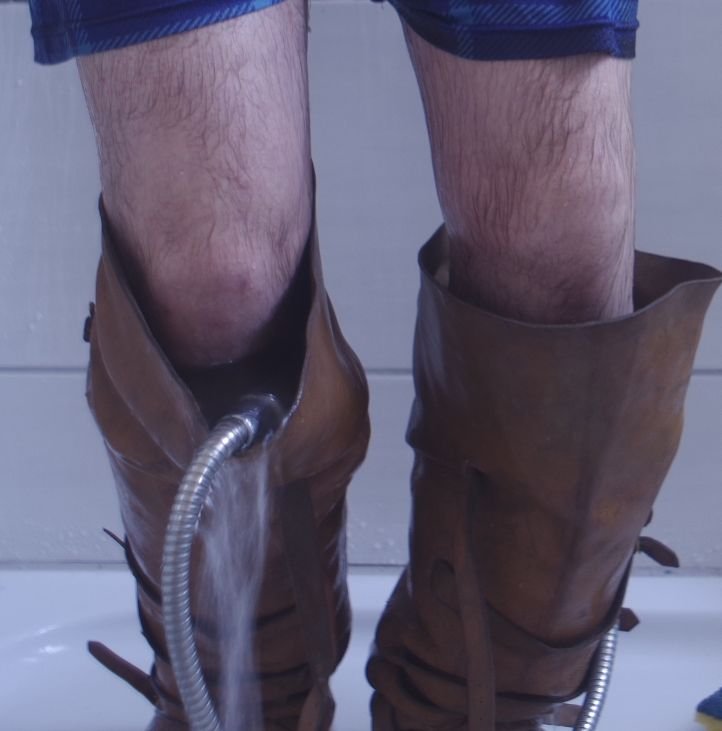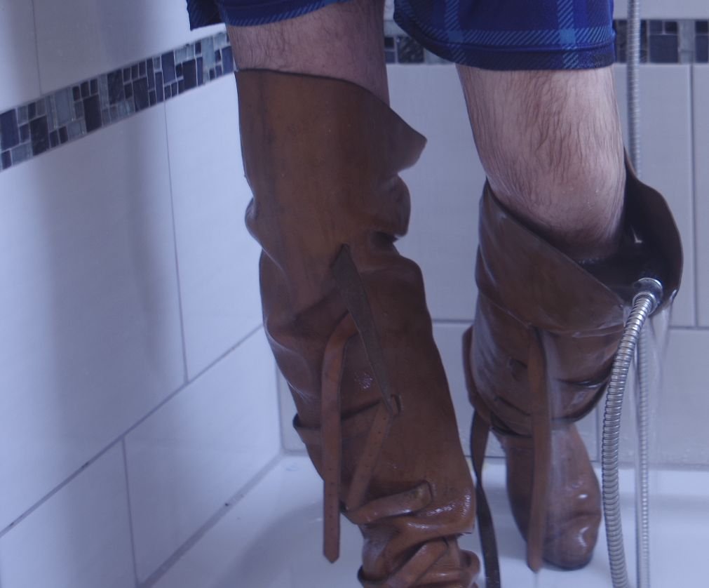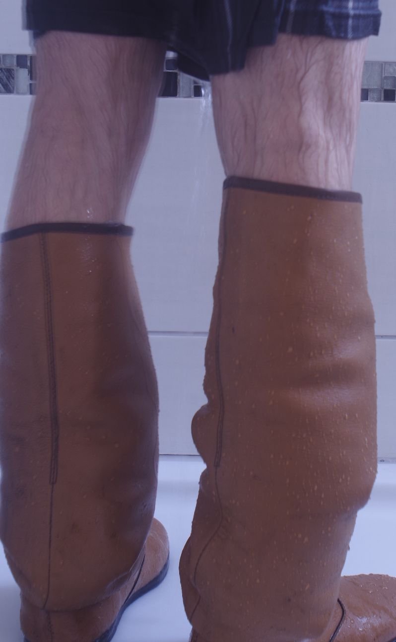 Schau wie die hohen Schäfte als nasse Lederlappen tief herunter rutschen.