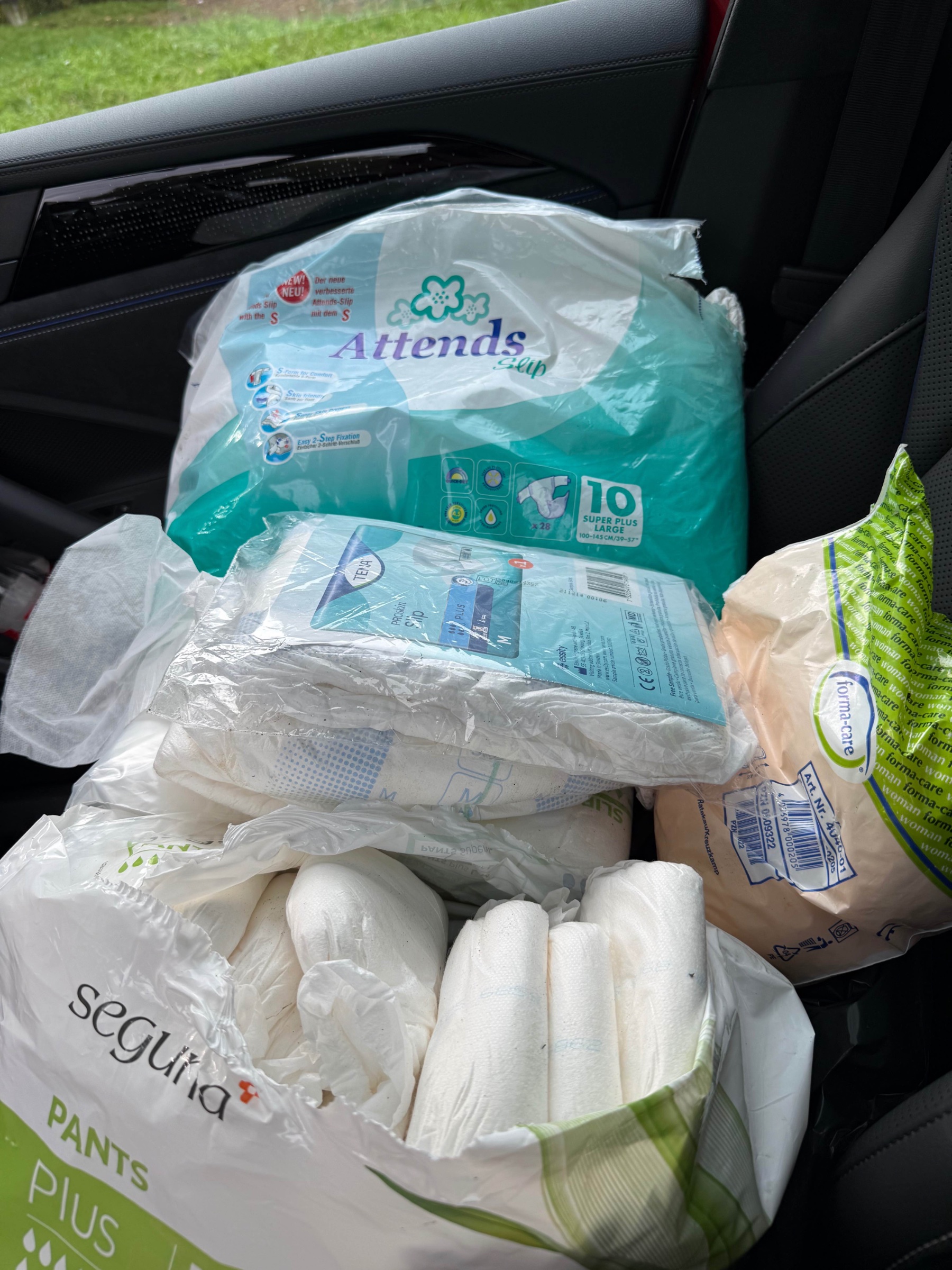 Diese ganzen armen Windeln für Erwachsene waren unbenutzt in einem Müllcontainer auf der Autobahn entsorgt. Habe sie selbstverständlich gerettet.