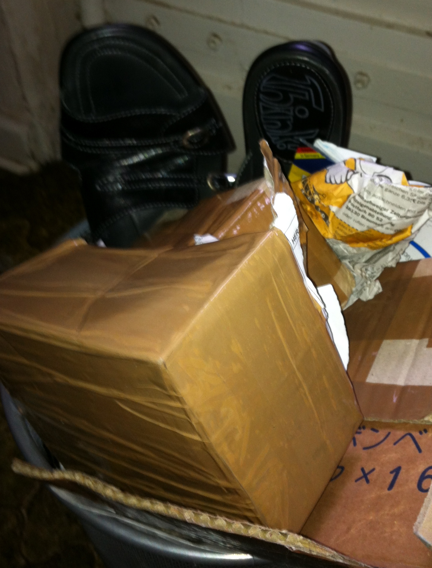 Hier zwei Fotos von einem Paar Schlappen, die keine Stunde alt geworden sind. Eine Angestellte hat sie sich gerade gekauft, ist mit ihnen umgeknickt und hat sie wutentbrannt, weil was abgerissen war, in den Papierkorb gestopft. Schnelles Foto - daher unscharf. Dann wanderten sie auch schon in den Container und von dort ging es nach 5 Minuten in den Müllwagen. Keine Rettung möglich. Diese Riesenfrau trägt Schuhgröße 43-44.