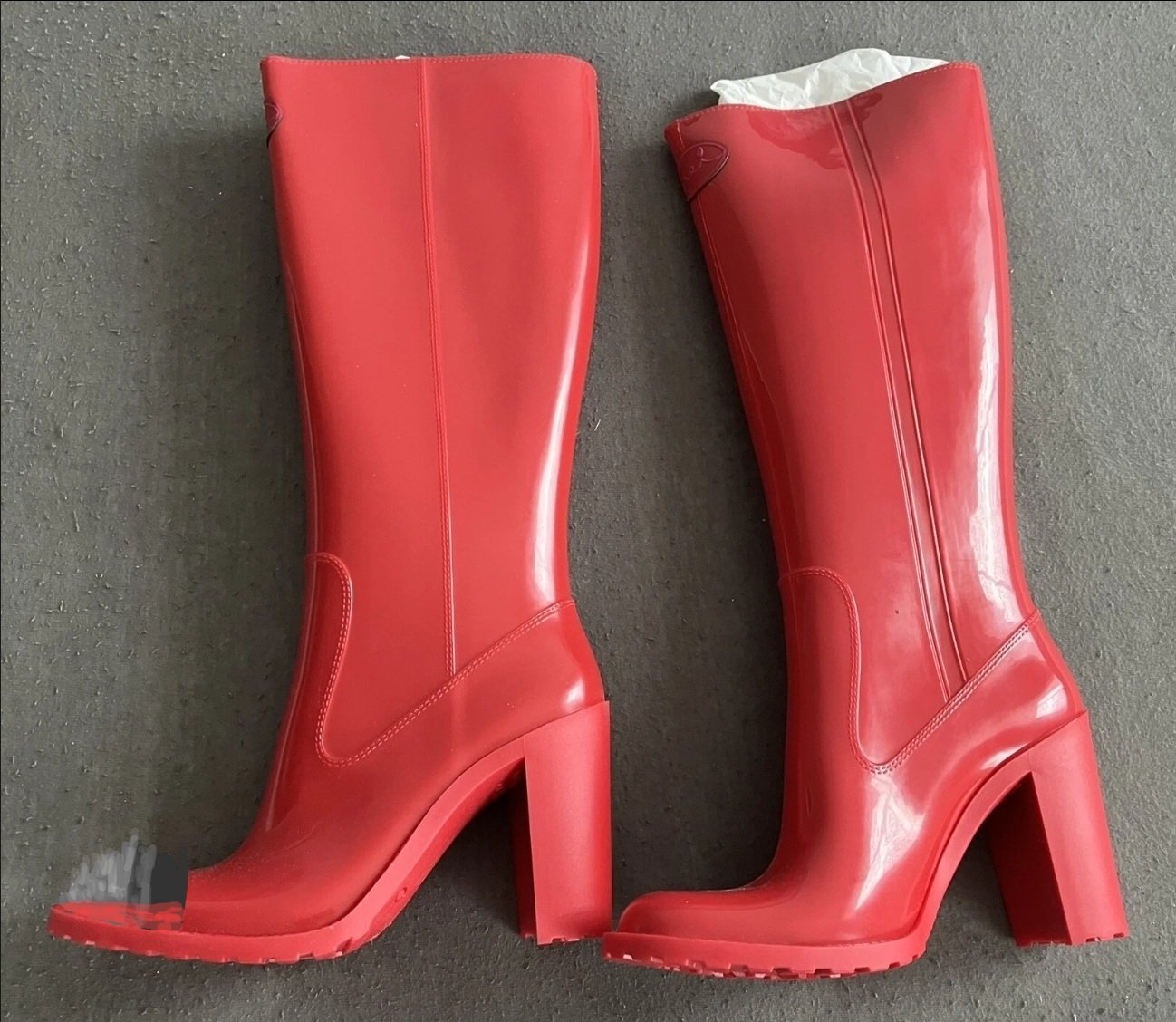 knallroten PVC-Gummistiefeln? Mit solch unglaublich hohen Absätzen sehen sie ziemlich freizügig aus, nicht wahr? Oder gefallen Ihnen diese besser als die knallgelben Gummistiefel”?
