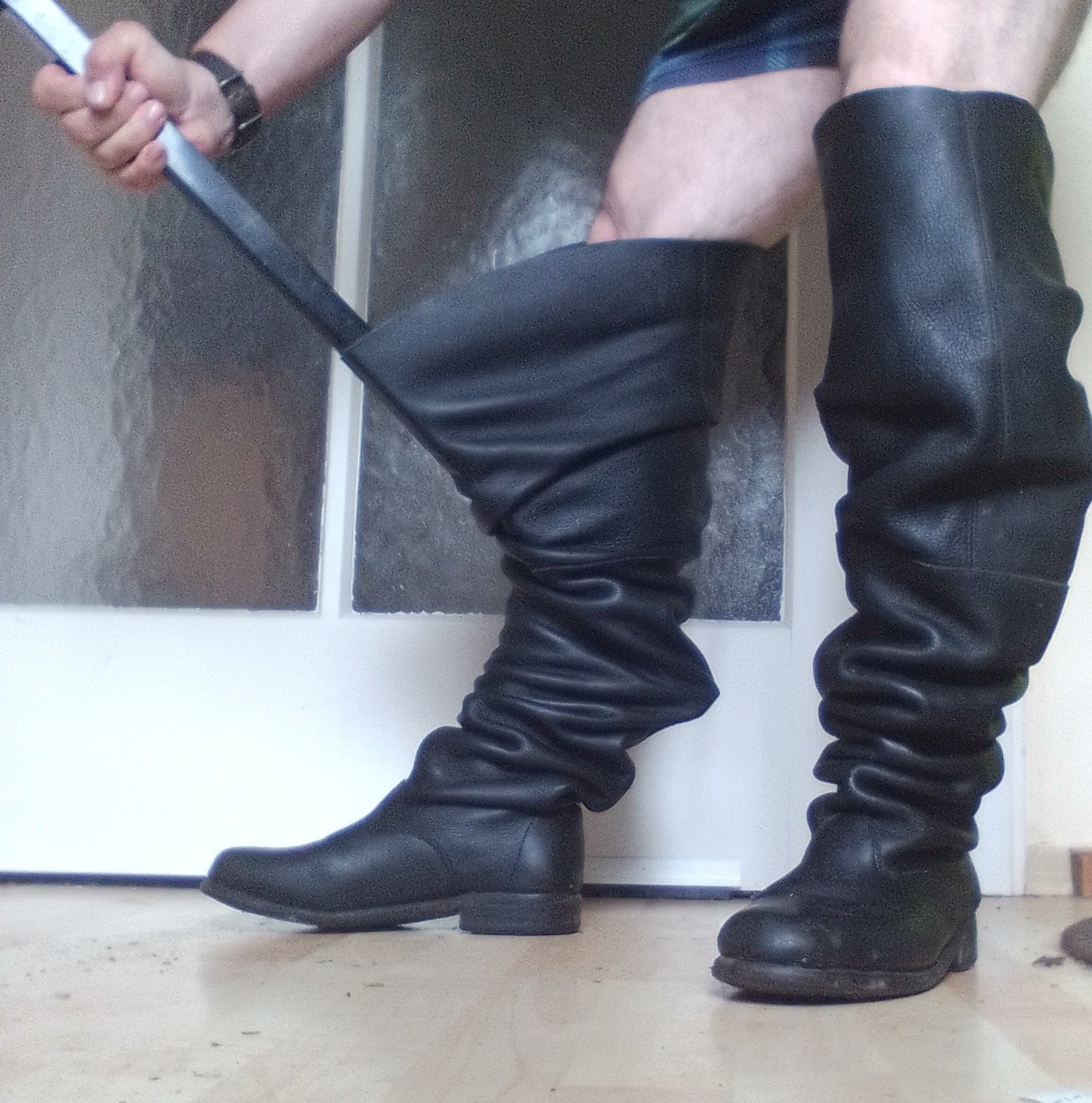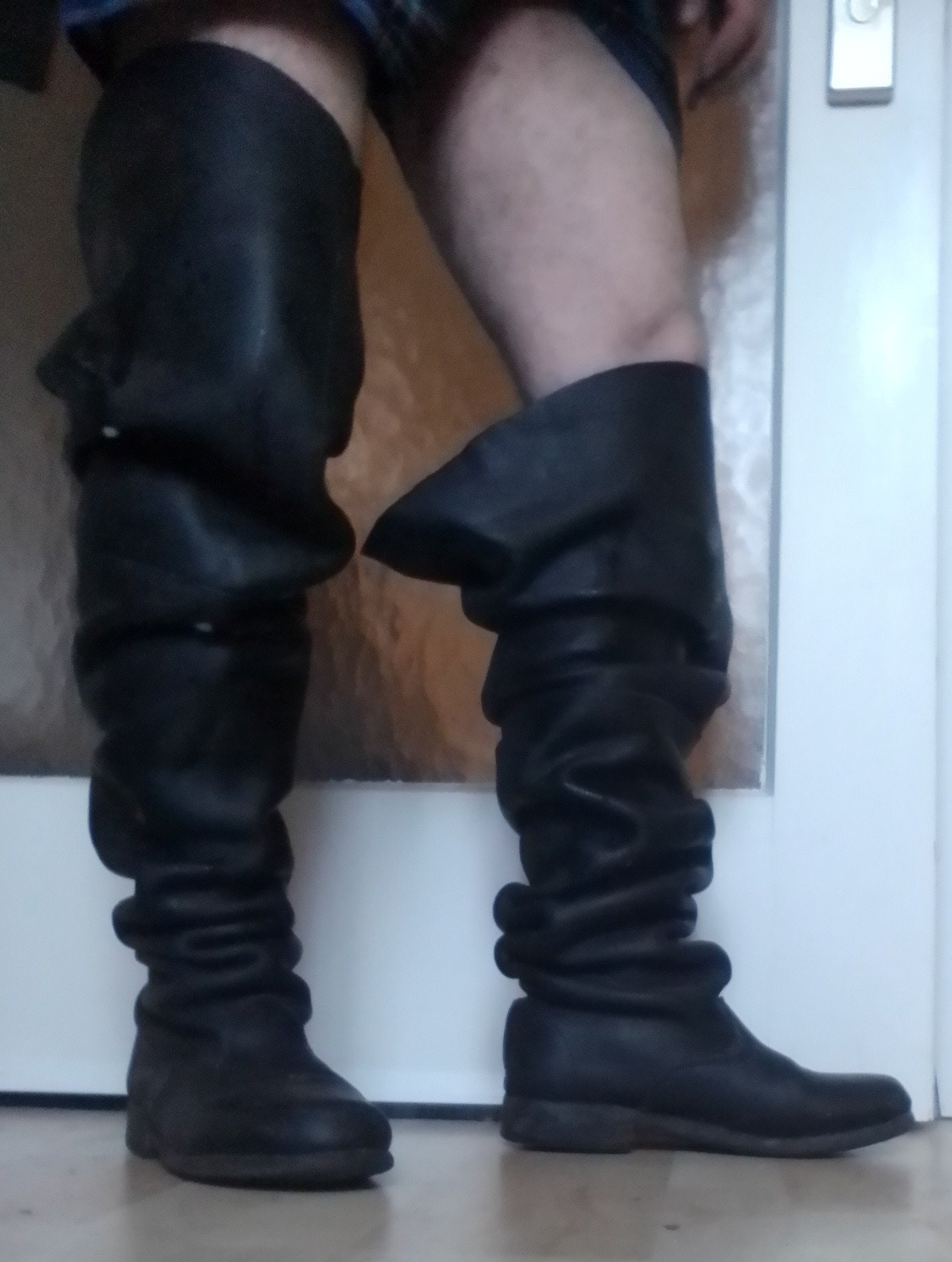 Durch ständiges tragen und besamen ist das Leder schon schön weich geworden und die weiten Schäfte rutschen langsam herunter bis auf Kniehöhe..