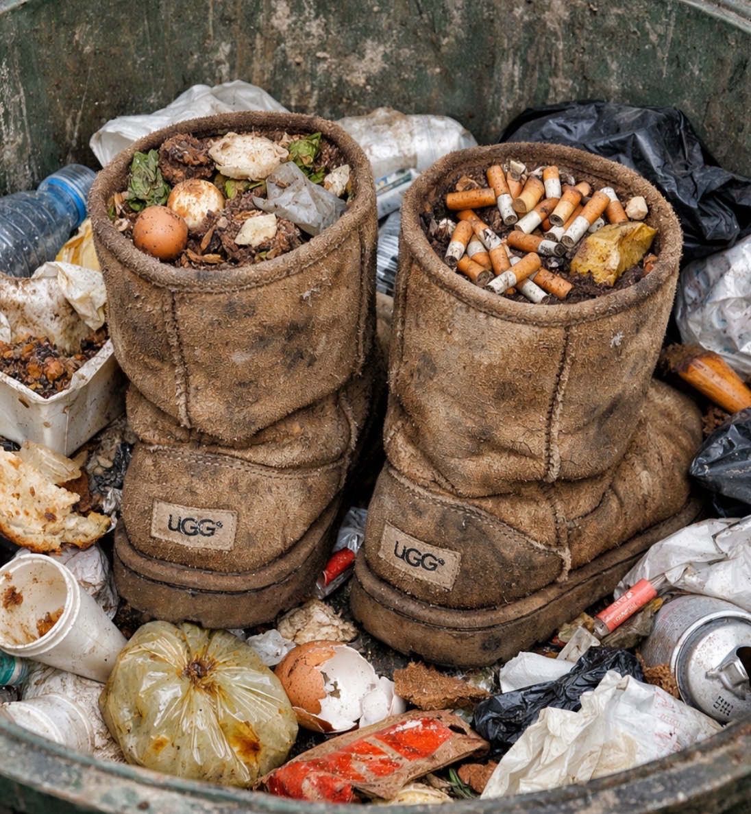 Vor einiger Zeit bin ich an einem Altkleidercontainer vorbeigekommen. Es hatte geregnet, der Boden war matschig, durchsetzt mit dunklem Schlamm, alten Pappfetzen und undefinierbaren Resten, die dort offenbar schon länger lagen. Direkt daneben, halb im Dreck versunken, stand ein Paar hellbraune UGG-Stiefel. Sie waren uralt, die Sohlen völlig schief gelaufen, das Wildleder stumpf und fleckig, an manchen Stellen fast schwarz vor Schmutz. Wenn man näher kam, stieg einem dieser säuerlich-modrige Geruch in die Nase – eine Mischung aus feuchtem Keller, altem Schweiß und Straßenstaub.