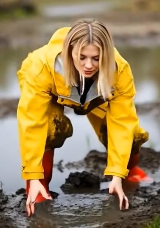 Sie beschmiert ihren gelben Regenanzug noch mehr mit Schlamm.