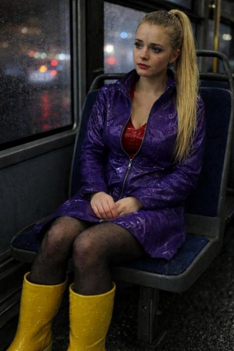 #Foto 10.15 Lenas lila Lacklederjacke ist nass geworden, als sie im Bus nach Hause fuhr
