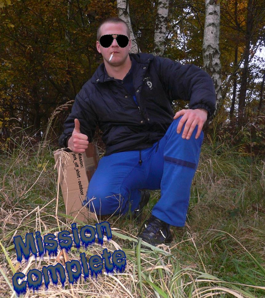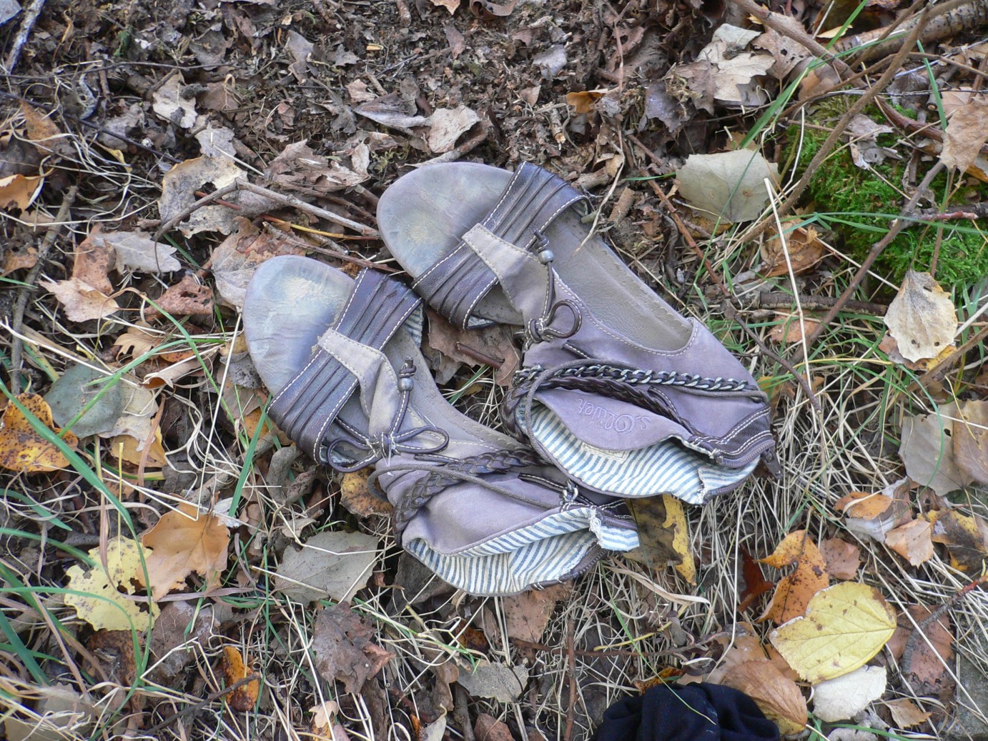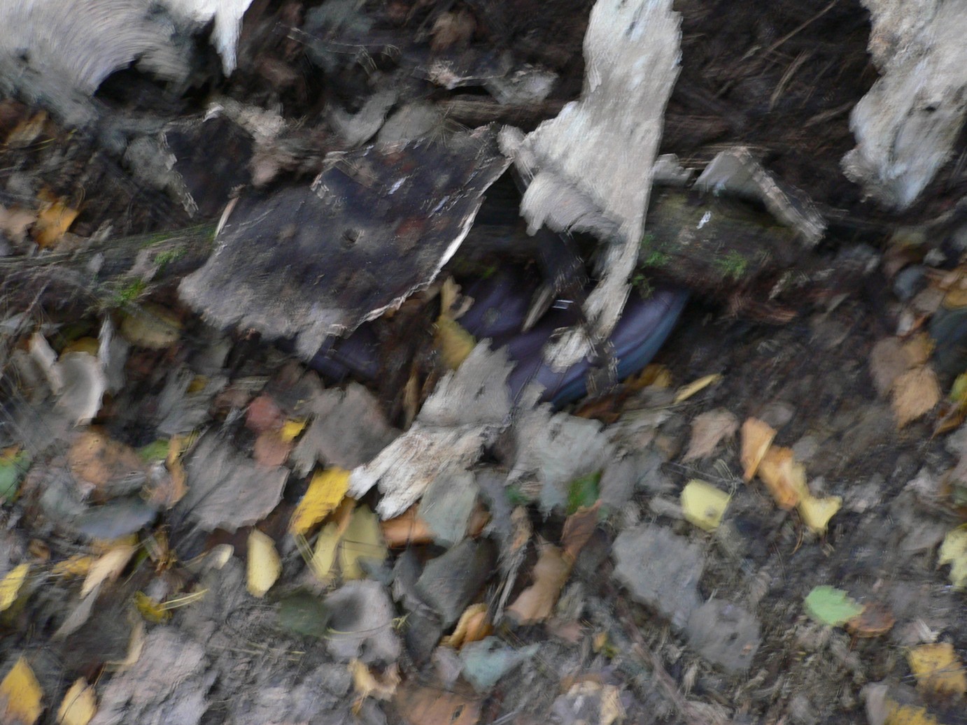 Das erste Teil ist die graue Sporthose aus Kunstgewebe. Die hat meinen Lieblingsplatz im Schlammbecken an der Straße gefunden. Dort hat sich schon einiges von mir aufgelöst, weil der Schlamm wahrscheinlich etwas "agressiv" ist. Ein paar Meter weiter befindet sich gleich das kleine Waldstück, wo ich gerne mal was auslege.