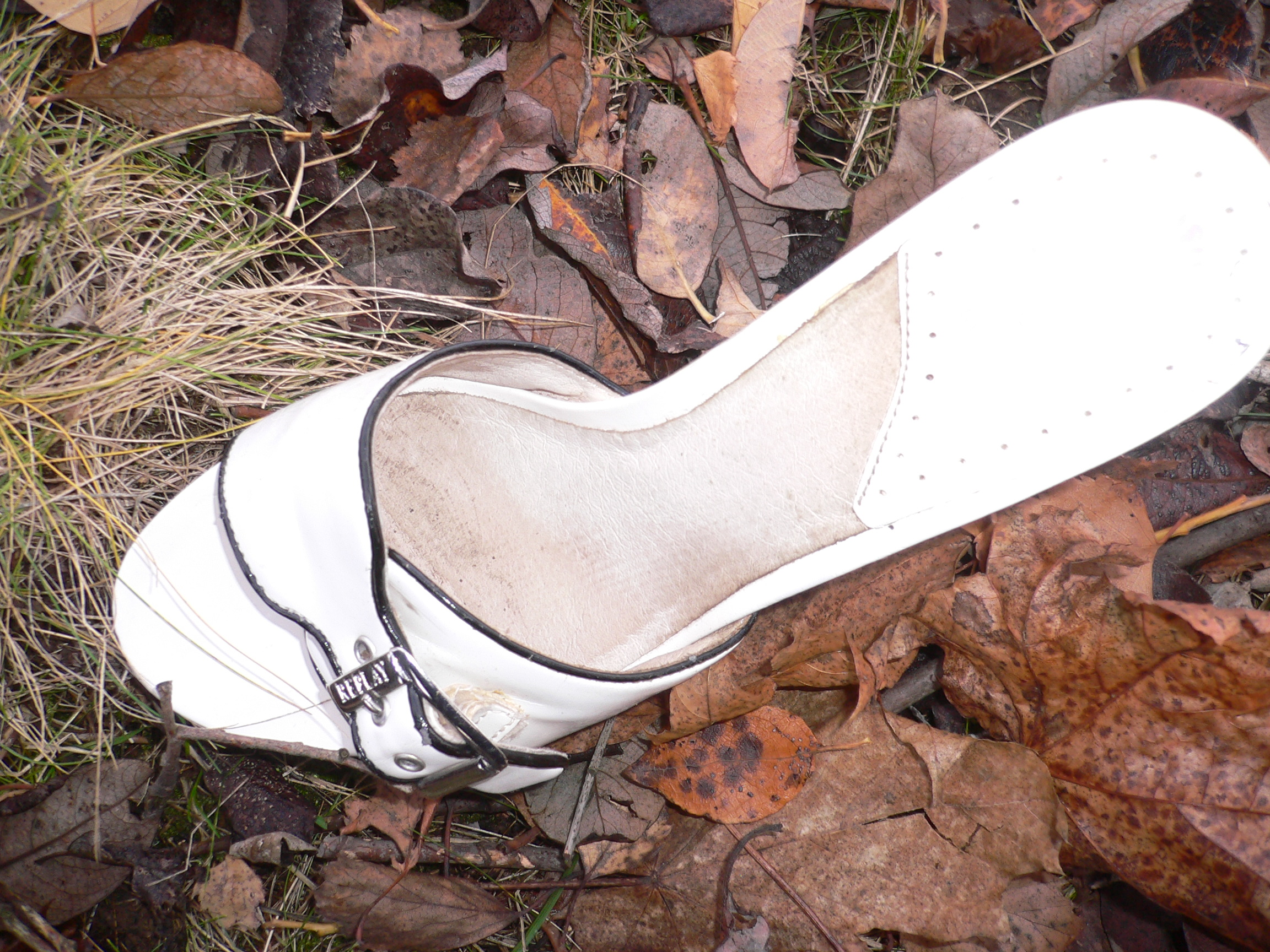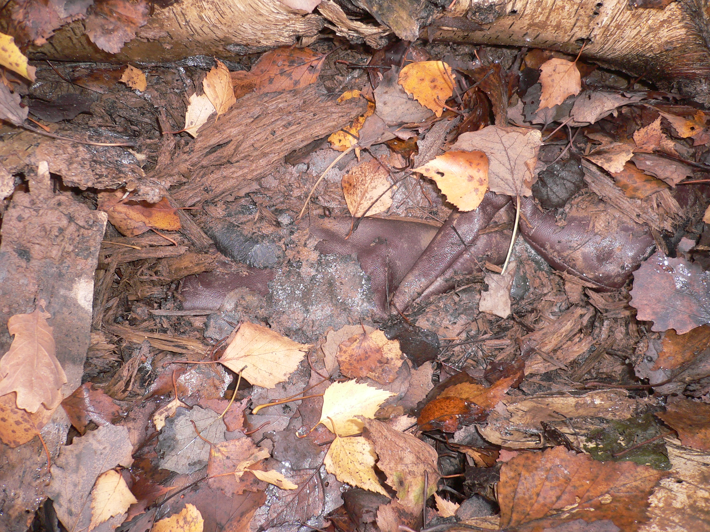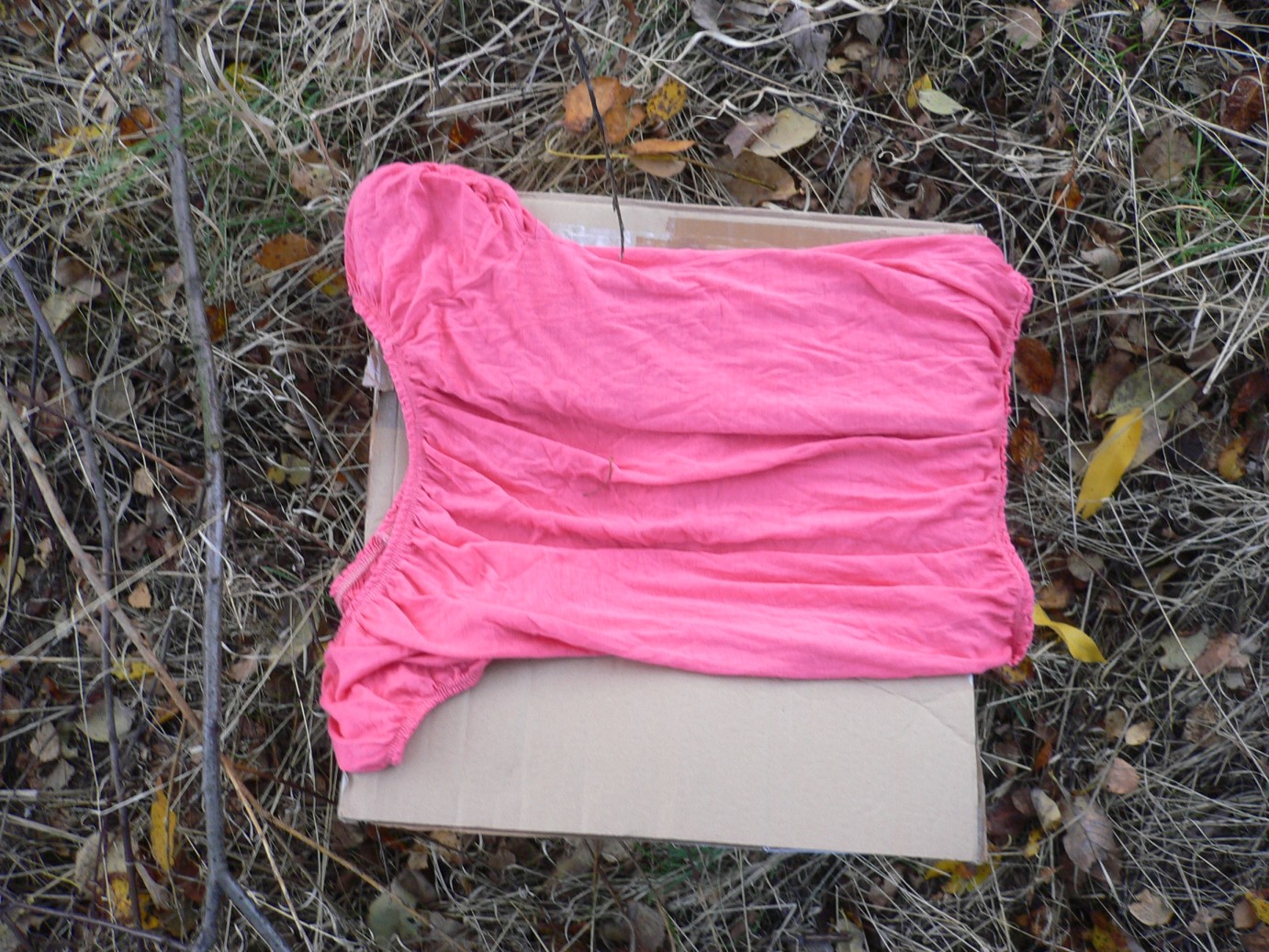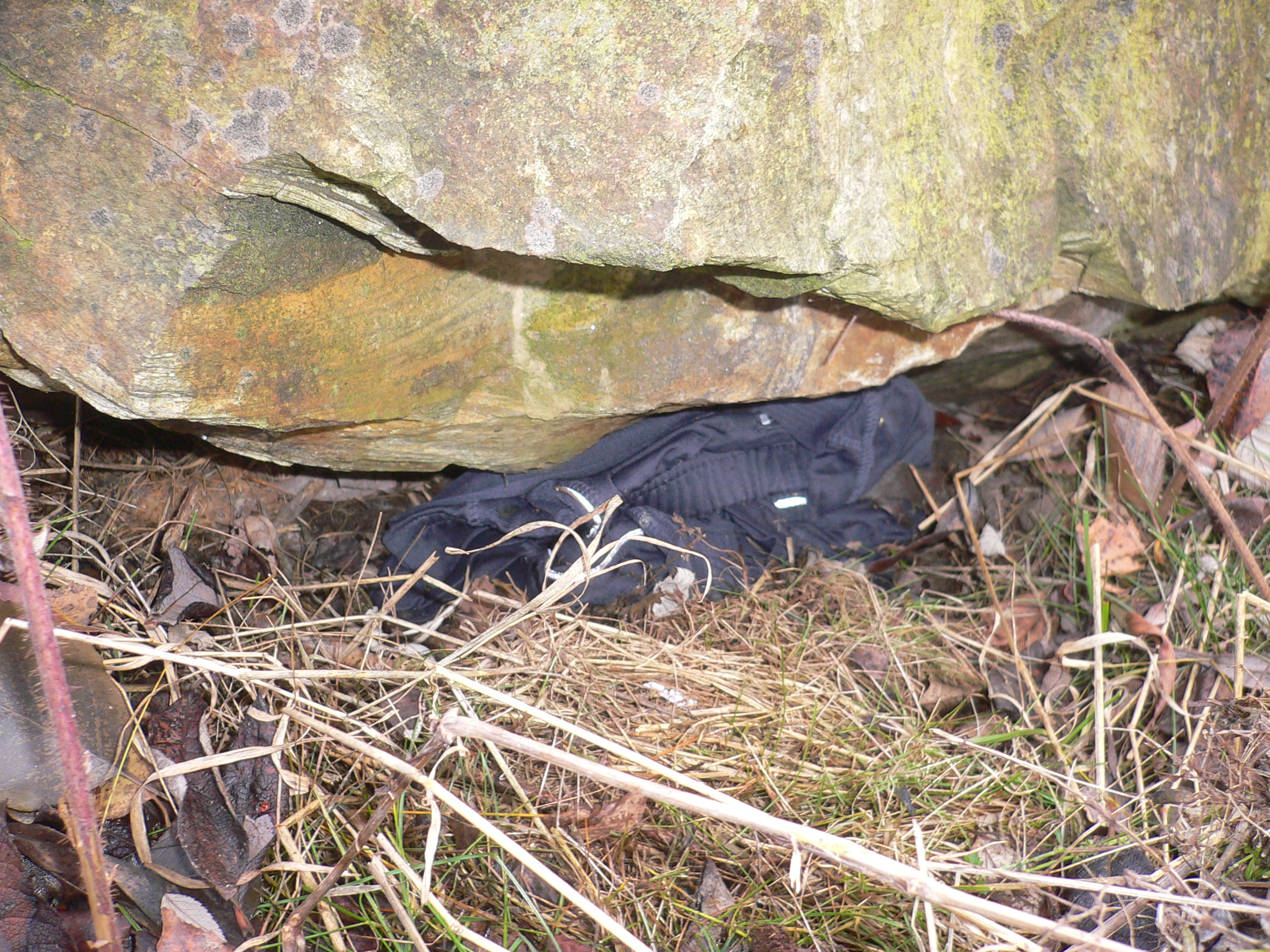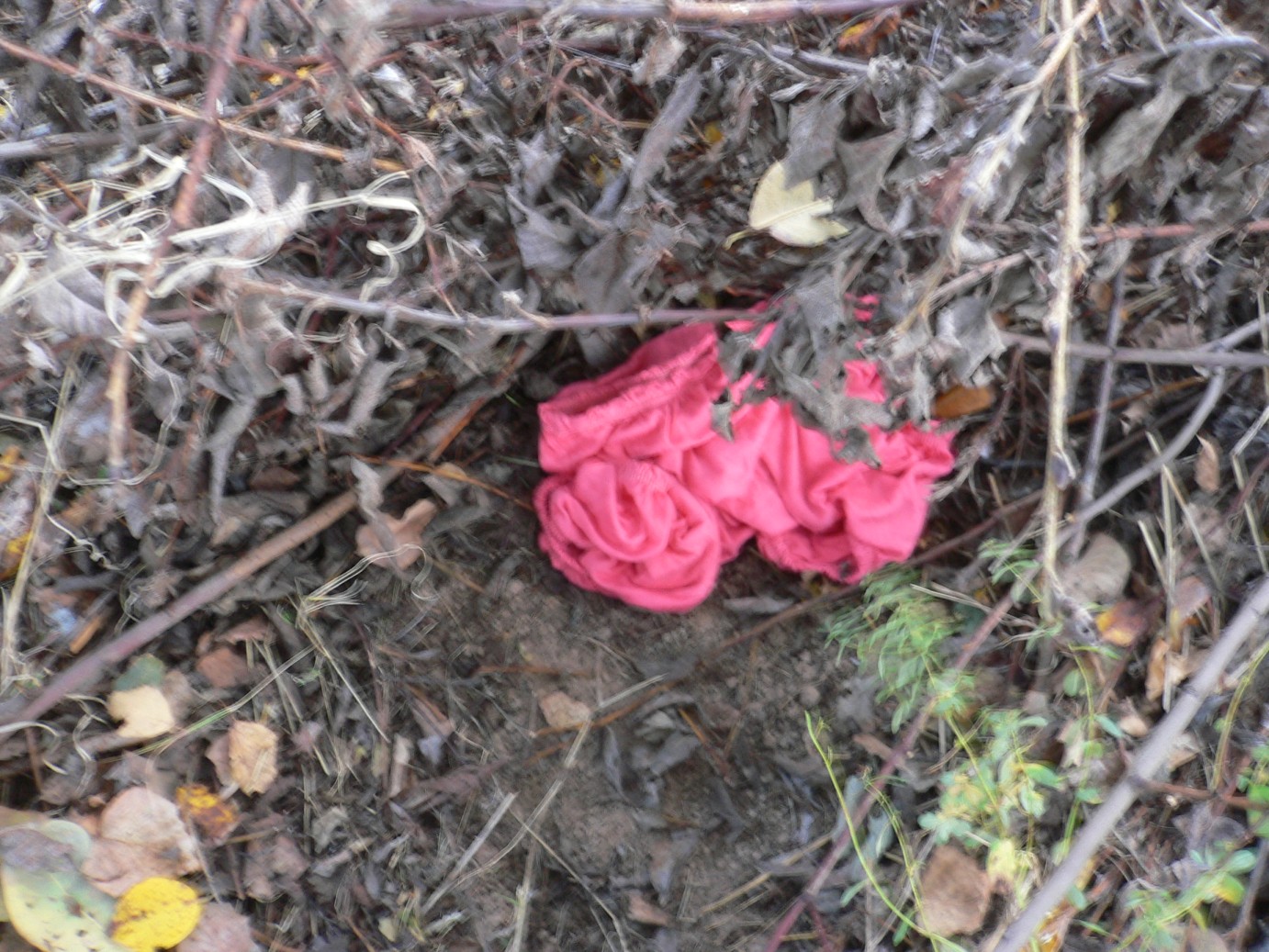 Das erste Teil ist die graue Sporthose aus Kunstgewebe. Die hat meinen Lieblingsplatz im Schlammbecken an der Straße gefunden. Dort hat sich schon einiges von mir aufgelöst, weil der Schlamm wahrscheinlich etwas "agressiv" ist. Ein paar Meter weiter befindet sich gleich das kleine Waldstück, wo ich gerne mal was auslege.