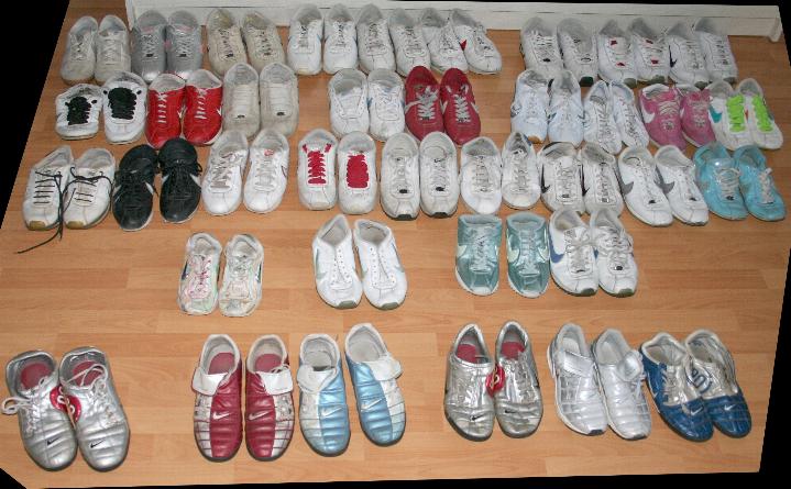 die auf den Bildern hab ich größtenteils noch. Alleine einen ganzen Karton nur mit Nike Cortez, und ganz viele andere *gg*,die ich nicht übers Herz gebracht hab in den Schuhhimmel zu befördern. Die meisten waren noname-Dinger, Stiefel, Pumps, Ballerinas ... bei ca. 400 Paaren kommt echt eine heftige Menge zusammen.