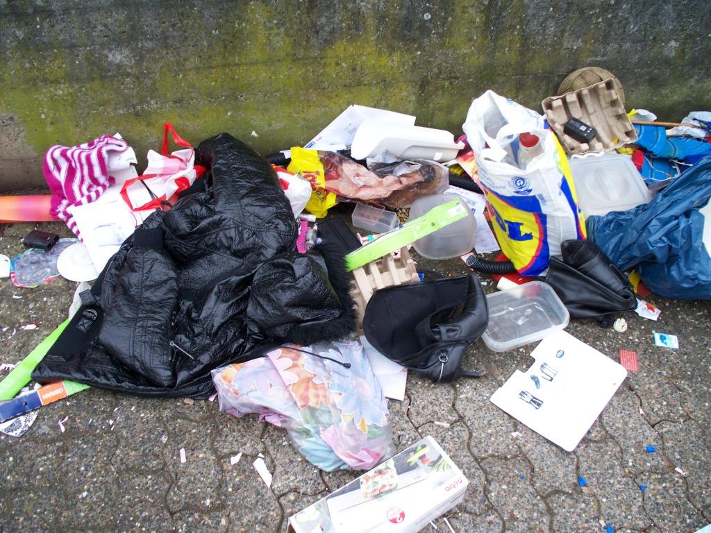 - Die kaputte Jacke und die akten Stiefel gehören eigentlich zwischen anderem kleinteiligem Abfall in den Müllcontainer!