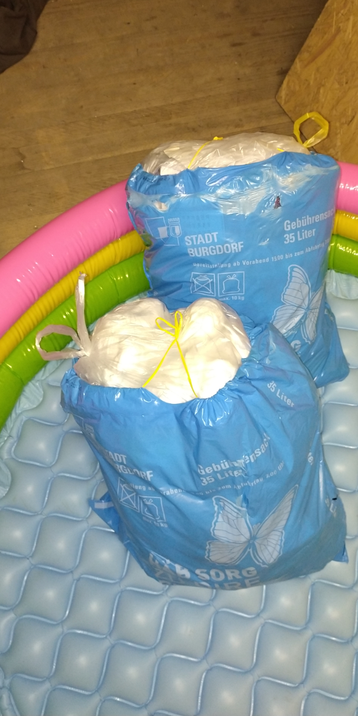 Das weiss ich auch noch nicht. Manchmal packe ich einfach Windeln in einen grossen Sack, breite den auf dem Boden aus und trete darauf herum. Ein tolles Gefühl wenn sich die vollen Windeln unter den Füssen verformen.