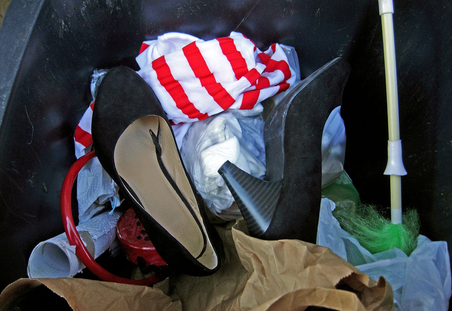 Nach Karneval direkt in die Mülltonne. Für die unscheinbaren Pumps und die Ringelstrumpfhose war die Feier vorbei. Bevor alles im Müllwagen verschwindet, erfolgte der Zugriff.