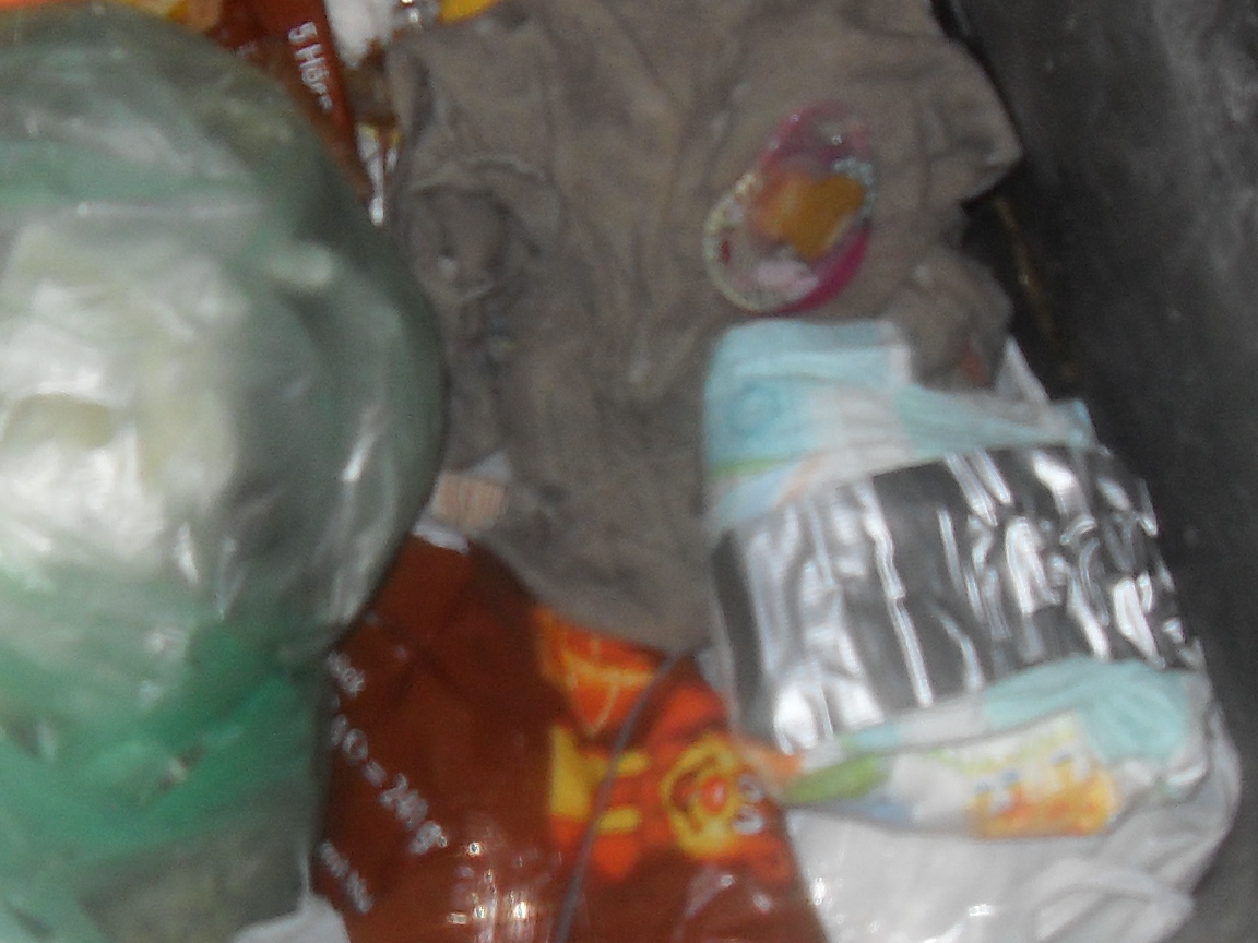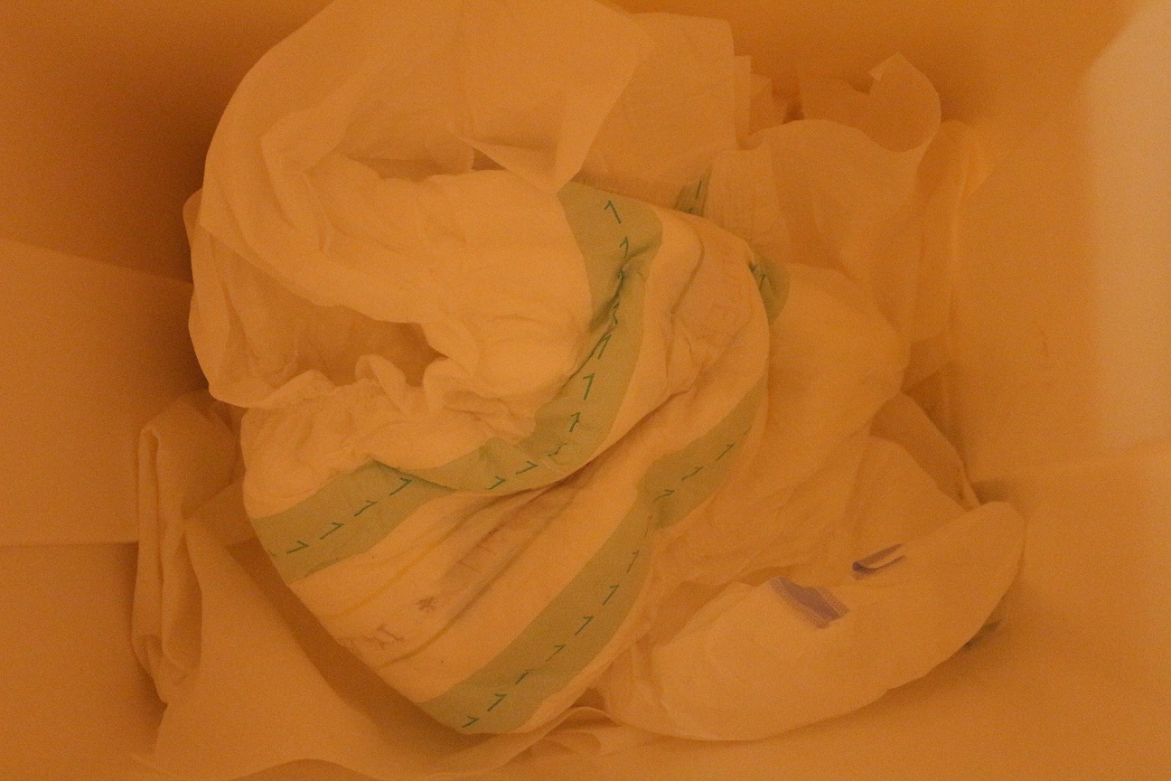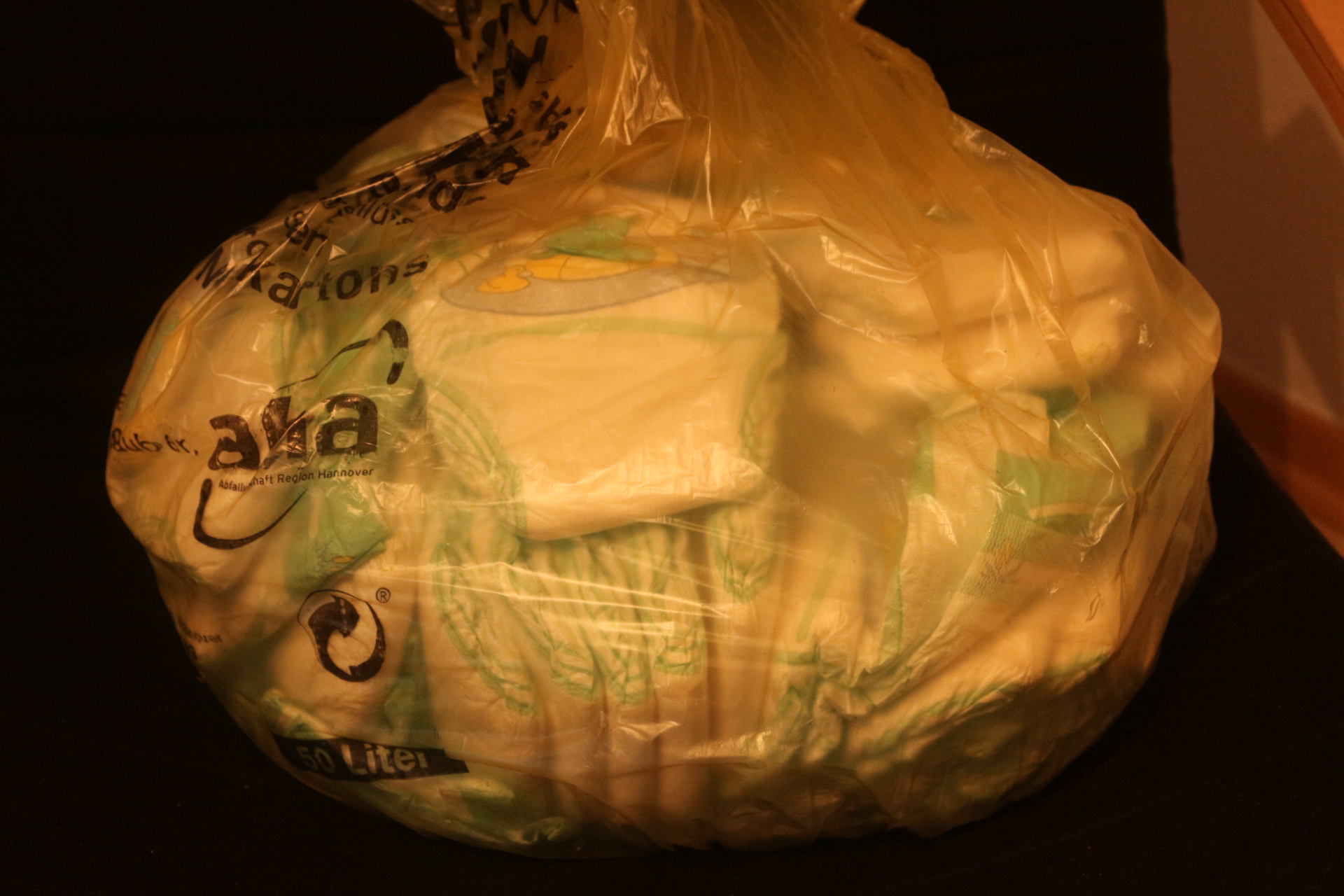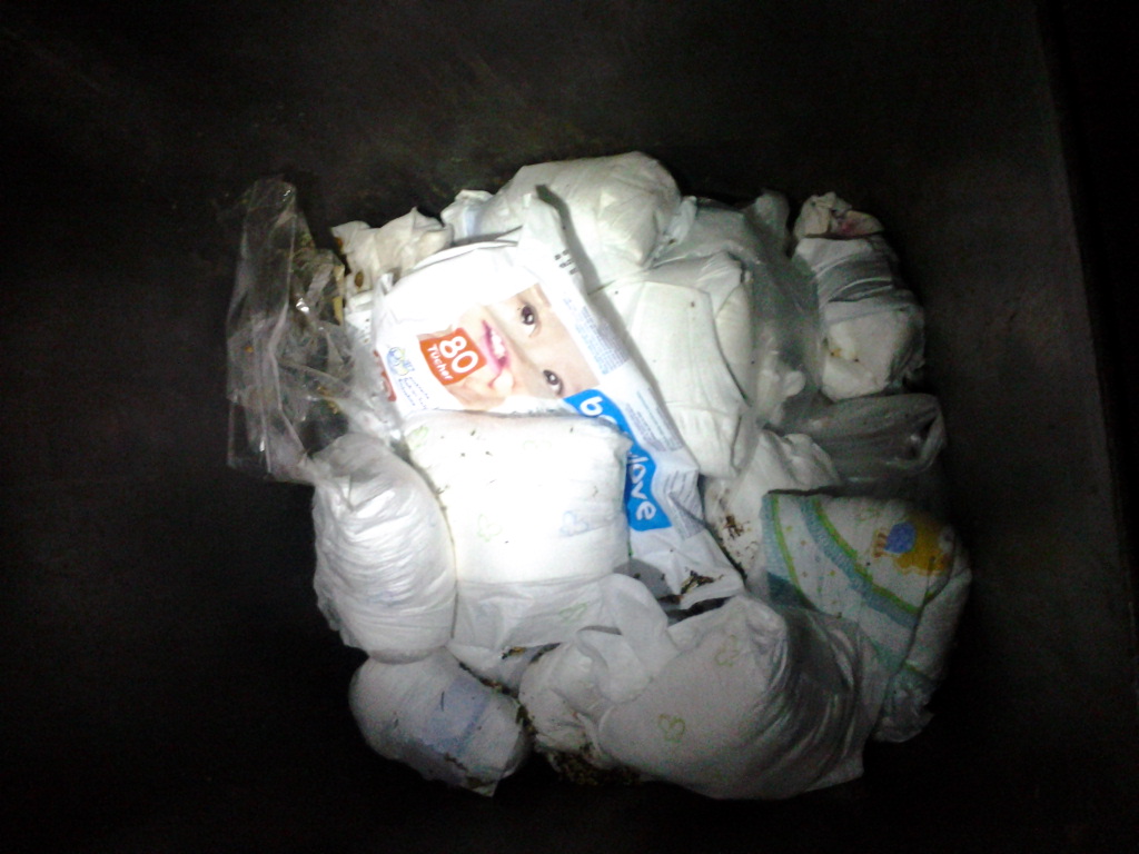 Heute abend beim Müll rausbringen: schöne, vollgesch*** Stinkewindeln. Der Gestank der Kack-Windeln kommt einem sofort beim Öffnen der Mülltonne entgegen.