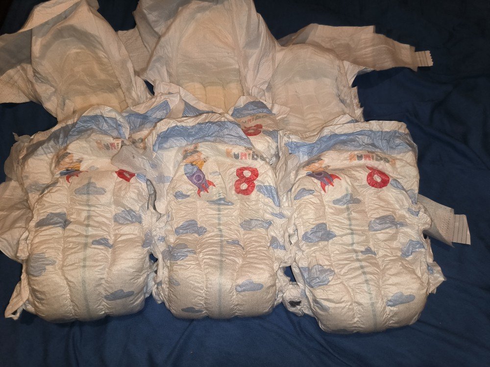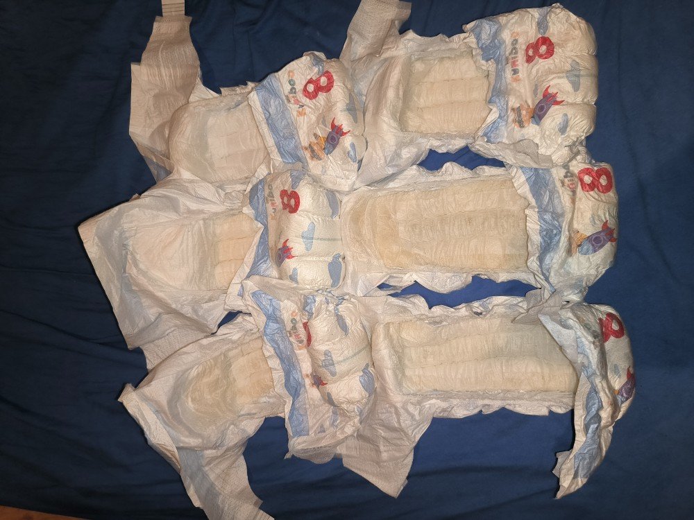 nach längerer Zeit konnte ich endlich mal wieder eine größere Menge wunderschöner Pampers retten: nicht weniger als 29 Stück in Größe 8 hätten planmäßig heute früh Opfer der Müllpresse werden sollen. Die Kacki-Windeln konnte sie gerne haben, die schönen Pipi-Windeln und ein Trinkfläschchen sind nun erstmal in Sicherheit. Dazu kamen noch ein paar Pampers Premium Protection in Gr. 6 und einen triefend nasse Babylove in Gr. 8