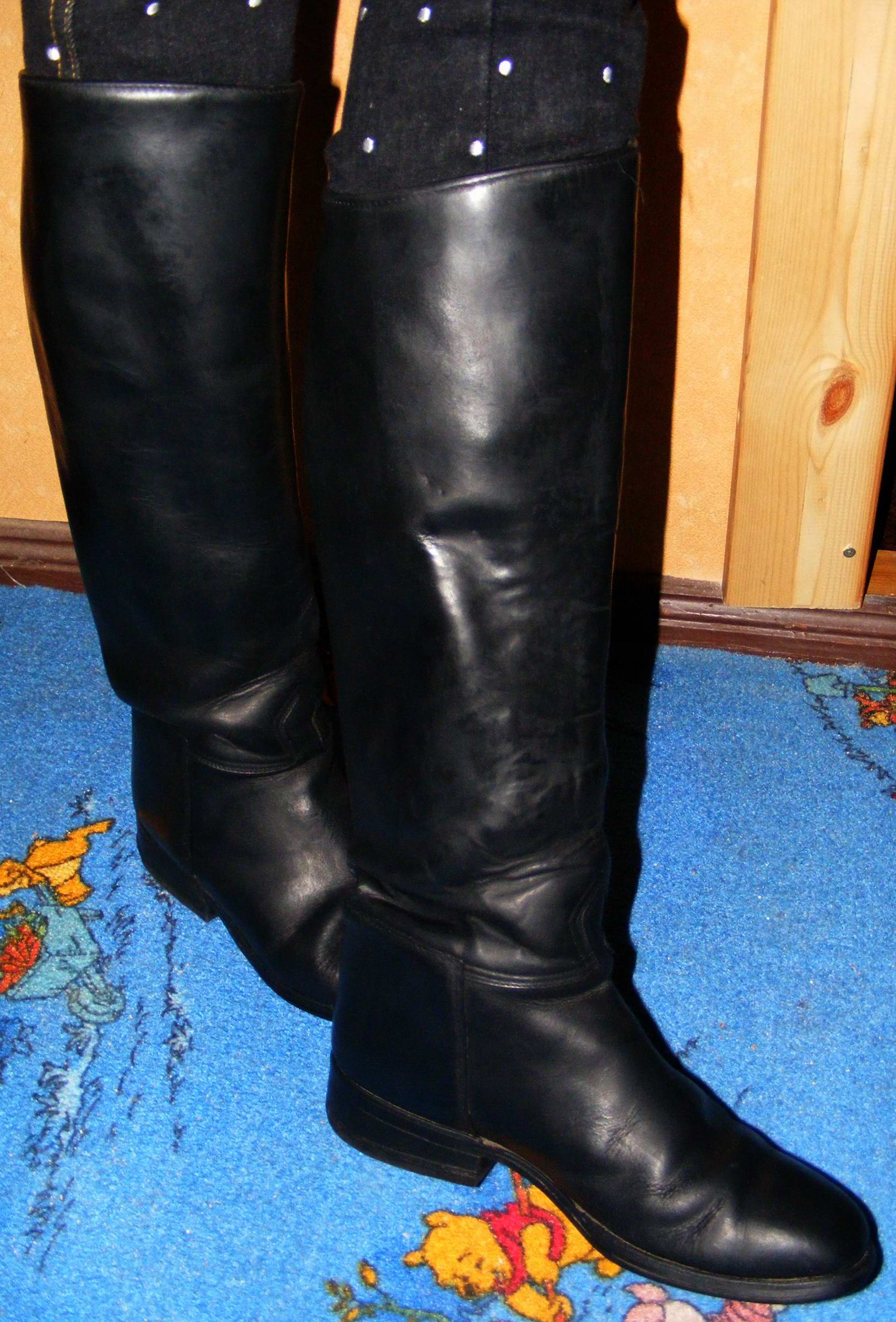 Ich hatte es ja bereits (in dem oben verlinkten Beitrag) geschrieben, diese 39er Reitstiefel vom Sperrmüll hatten wir vergeblich versucht, bei meiner BF im Küchenherd zu verbrennen und deshalb mit nach Hause genommen, für unsere Heizung. Da lagen sie nun auf dem Haufen des Wintervorrates. Doch, da ich zwar an die 100 Paar Reiter-Art-Stiefel, aber noch keine "Echten" besitze, hat es mich immer wieder "gejuckt", sie wenigstens einmal anzuprobieren. Deshalb habe ich sie gereinigt und geputzt. Durch die Schuhkreme wurden sie weich und mit Glück fallen sie etwas größer aus, sodaß sie mir perfekt paßten. Da wir aber noch nicht sicher waren, was nun mit ihnen geschehen sollte, holte mein Mann den Fotoapparat, um wenigstens einige Bilder im getragenen Zustand zu machen. Du weißt doch sicher selbst, wie so Etwas dann abläuft: Stell dich mal so hin - dreh dich mal - schlag mal die Beine übereinander - usw., daß wir uns dann so "hineingesteigert" hatten ... na ja, das "Temperament" hat erwartungsgemäß gesiegt! :lol: