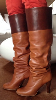 Da ich aber natürlich nicht ganz auf "Rot" verzichten will, habe ich ein Paar feuerrote weitschäftige flache "Reitstiefel", aus mattem Echtleder, die ich kombiniert mit einer roten oder weißen Jeans trage.