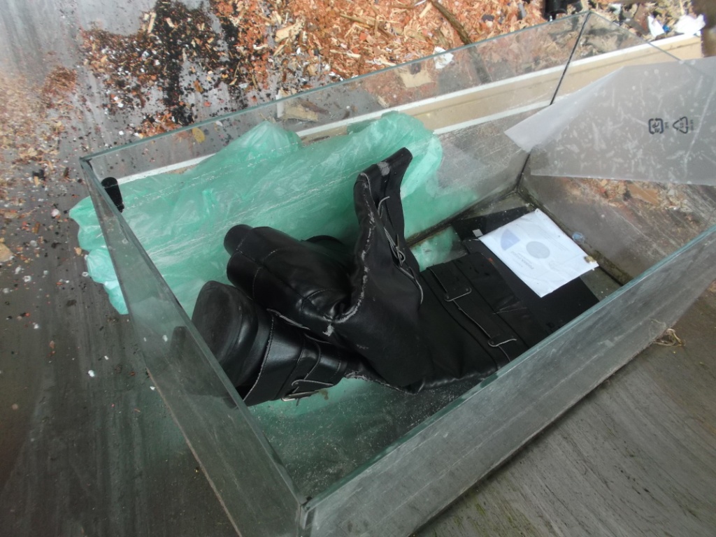 Mit Schwung ein Aquarium in die Müllschüttung geworfen. Noch blieb das Glas ganz. Darin alte geile Stiefel.