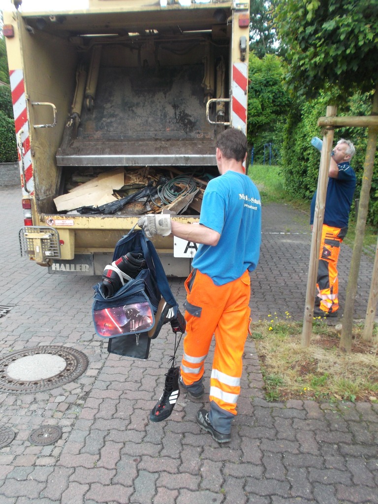 Ich war noch erschüttert über das böse Ende der netten Stiefel, als ein junger Typ aus dem Haus kam und dem einen Müllmann einen Rucksack mit lieblos reingestopften geilen Sneakern in die Hand drückte. Er meinte noch, seine Mülltonne wäre schon ziemlich voll. Nett wie Orangene Engel allermeistens sind, nahm der Müllmann den Rucksack mit in Richtung Pressmüllauto. Sein Kollege meinte noch, das Auto sei voll und müsse erst auf der Kreismülldeponie verkippen, aber der Rucksack könne noch gerade so reingepresst werden.