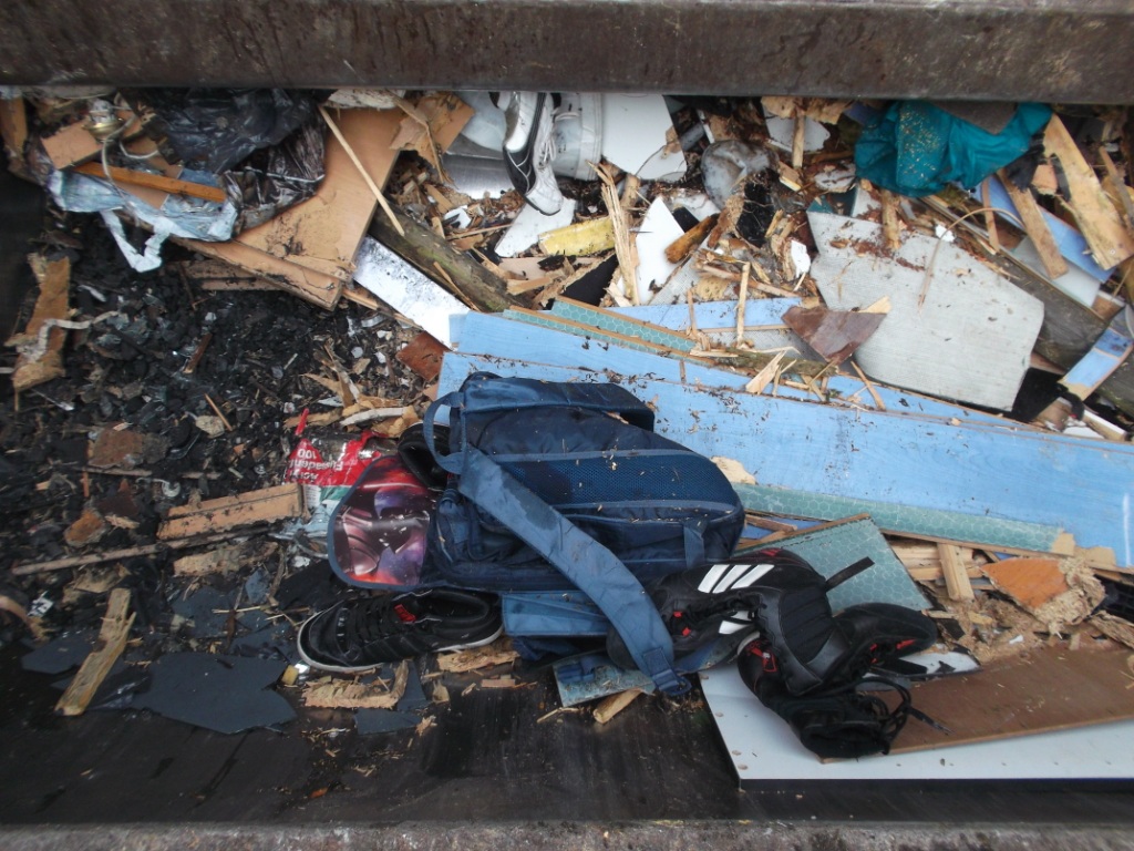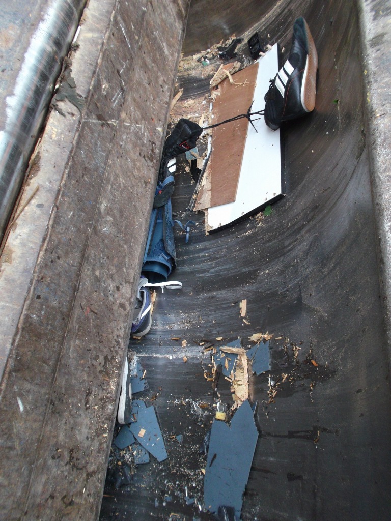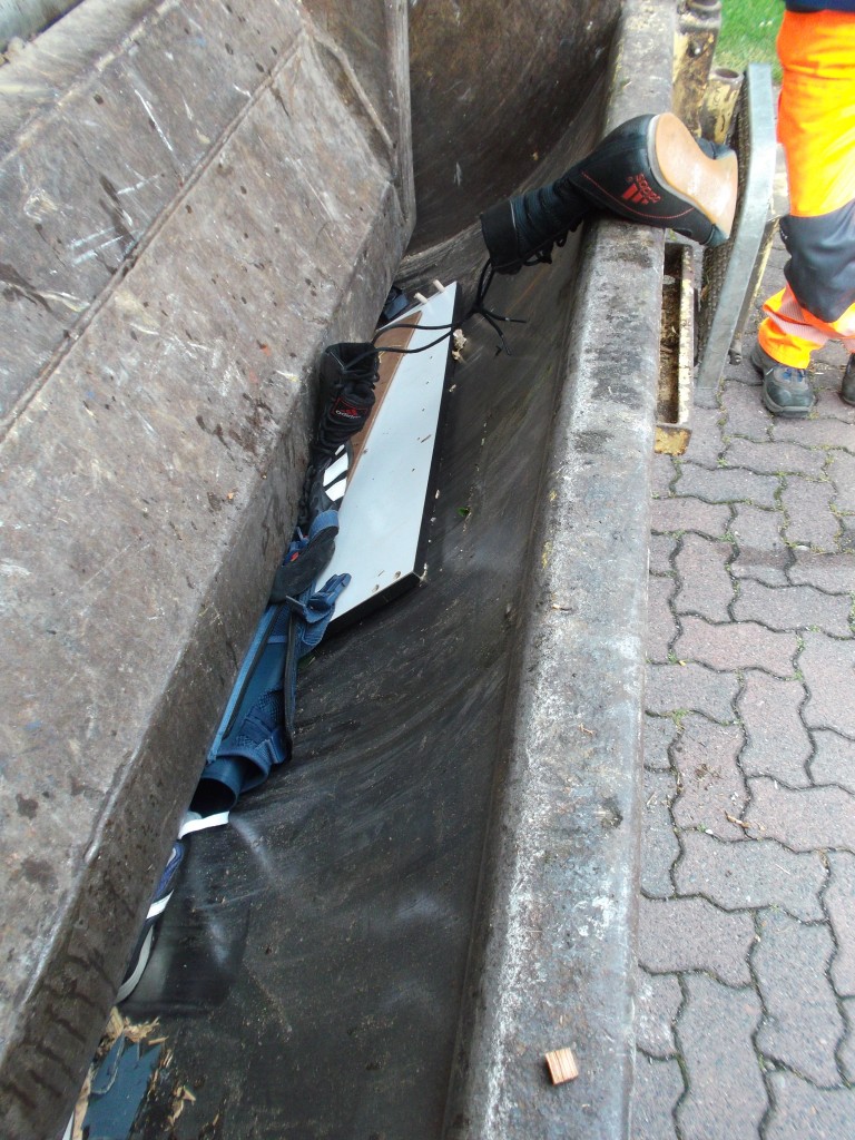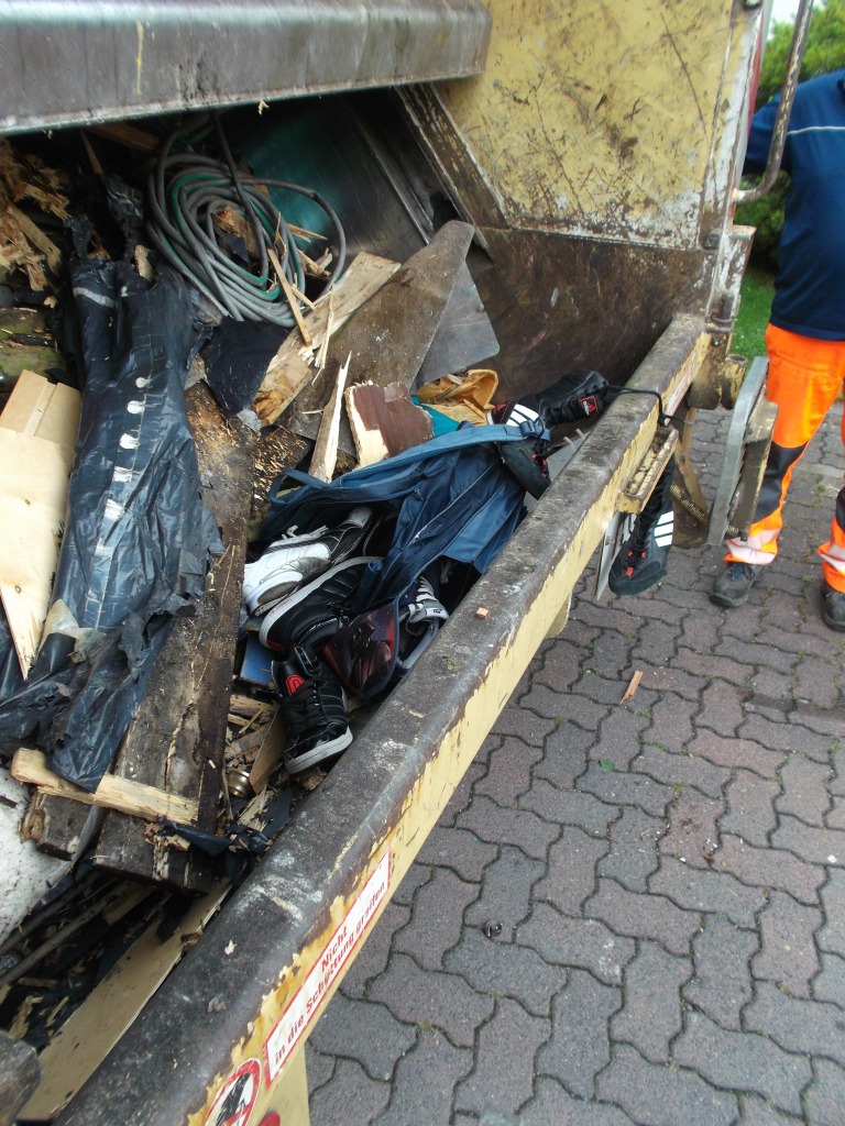Gepresste Sneakers rutschten ebenso wieder in die Müllschüttung zurück, wie Grillkohle aus einem geplatzten Sack.