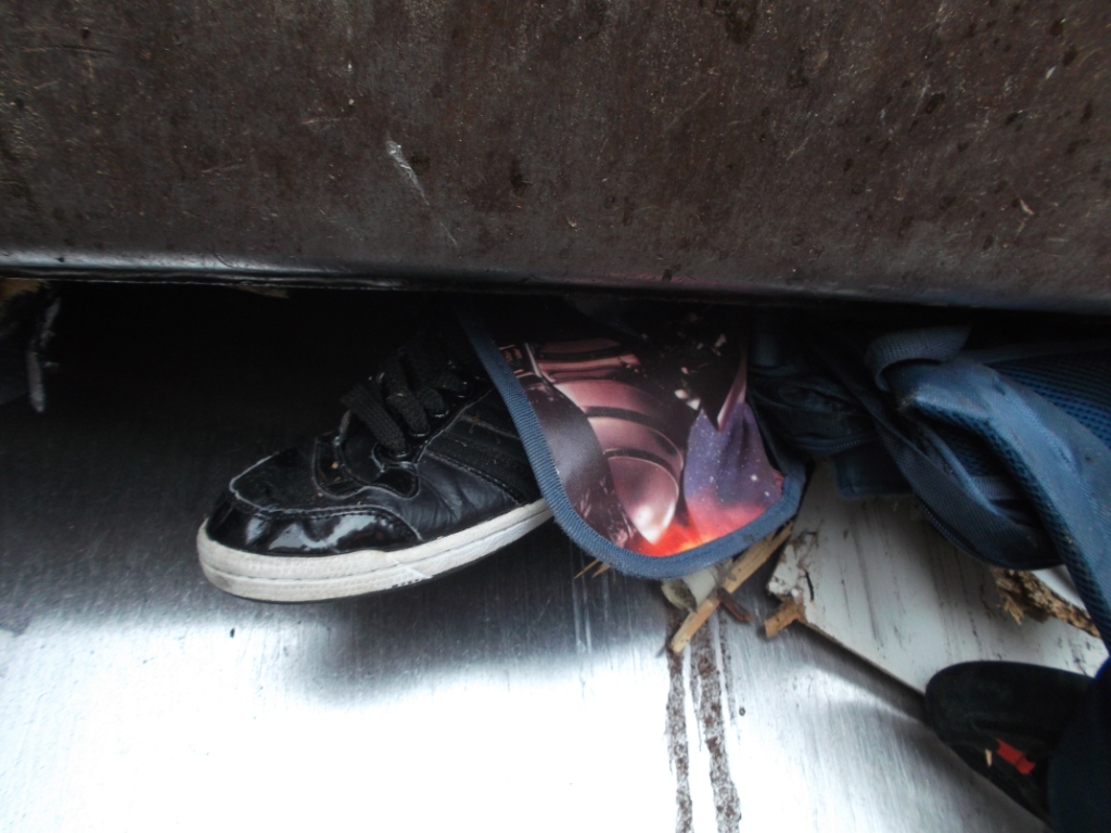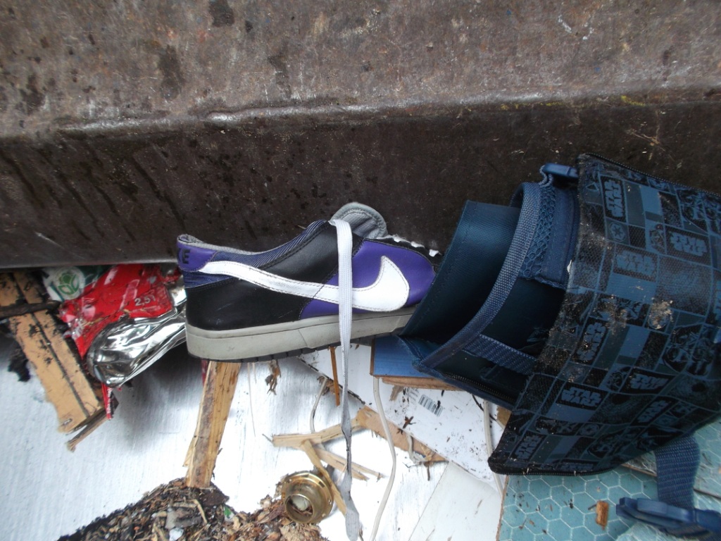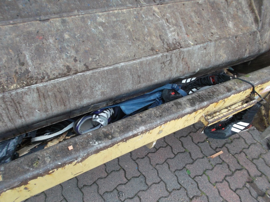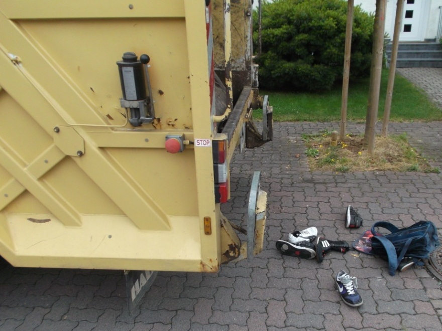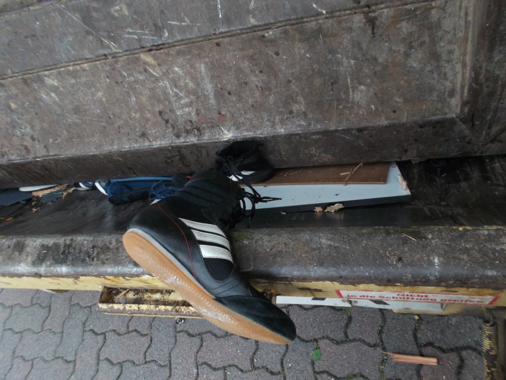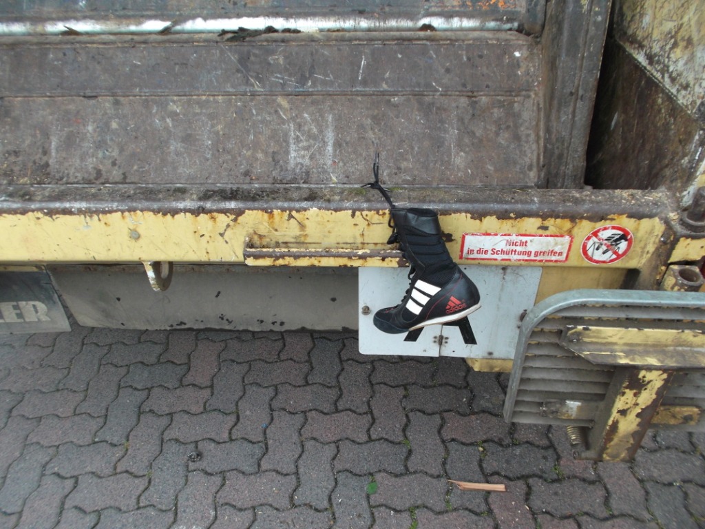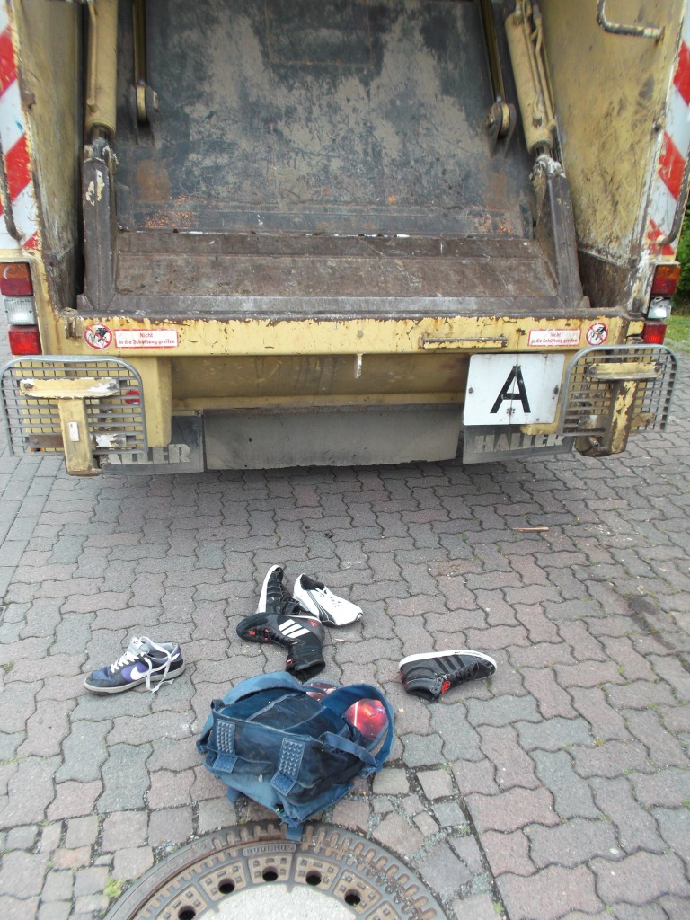 Noch ein letzter Blick ins Müllauto vor der Fahrt zum Verkippen: Geknickte weiße Pumas, zermalmte adidas-Stiefel, gequetschte Nikes und total gepresste und verschrammte Boxerstiefel udn ein total nun verfleckter, gepresster und teilweise von Splittern aufgespießter Starwars-Rucksack; - alles nur noch reif für die Müllkippe!