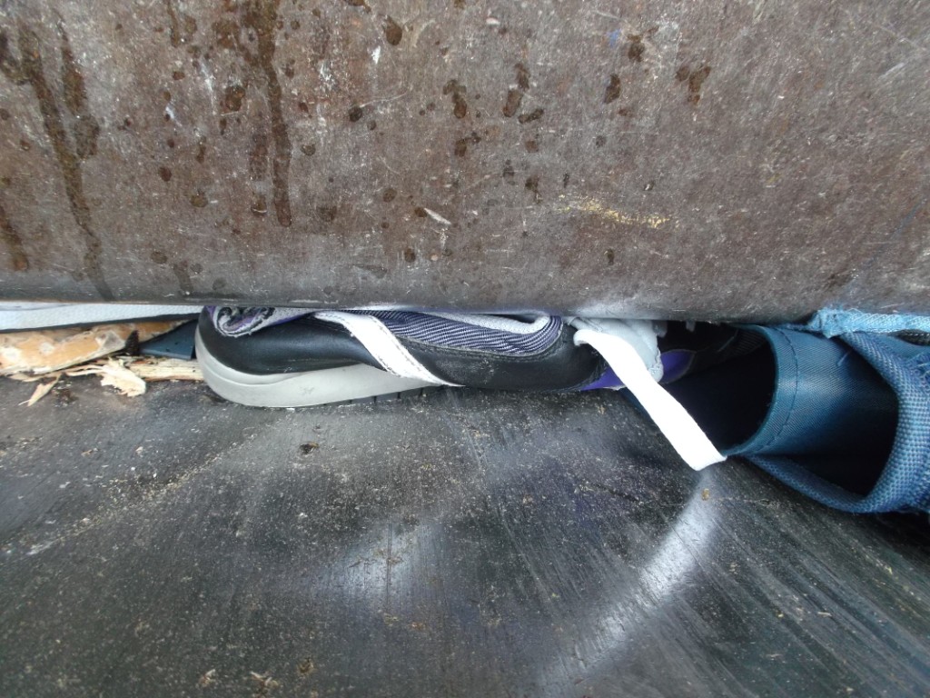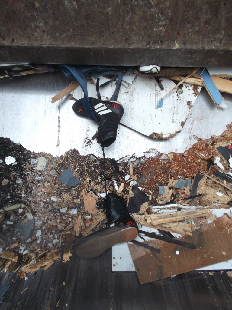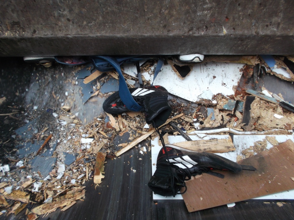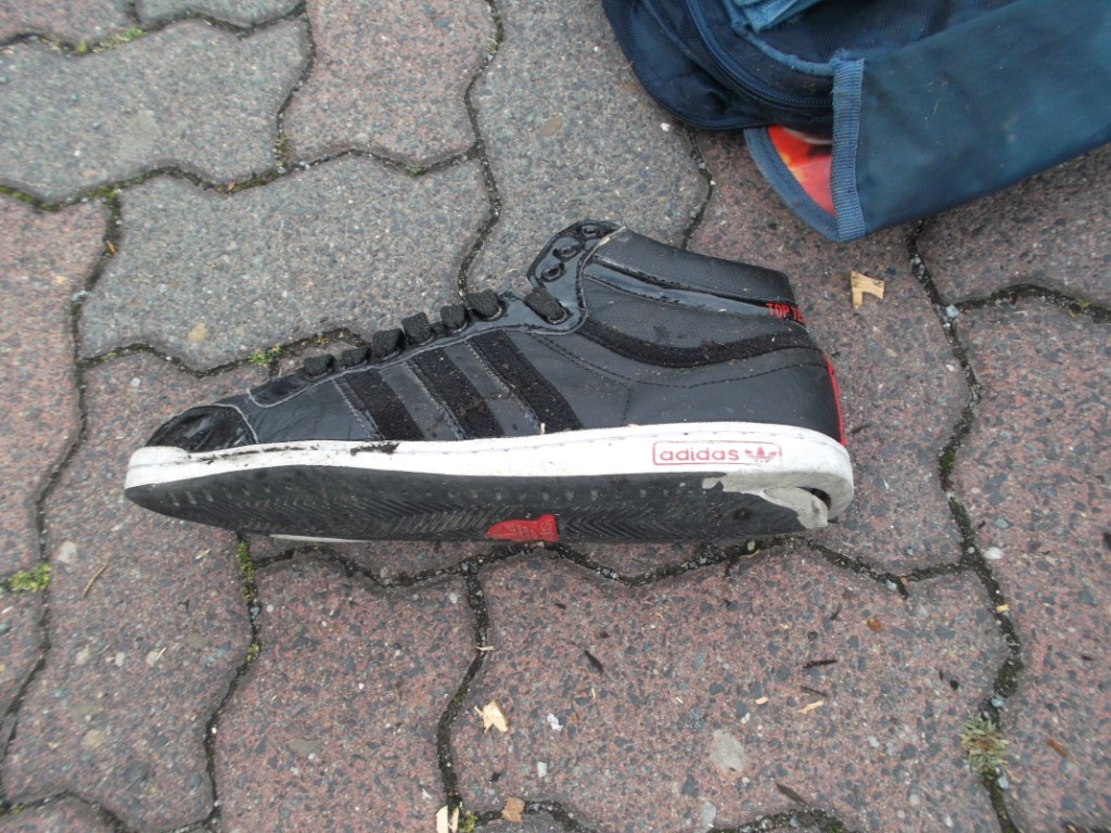 Hier kann man es gut erkennen: Dieses Paar adidas-Stiefel wurde so hart und brutal zermalmt, dass sogar die flexible Kunststoff-Sohle einen bleibenden Knick bekommen hat. Die Fersenkape war sicher eh nun zerbrochen. Aber das war ja alles nicht schlimm, denn die Schuhe sollten ja eh in den Müll und nicht mehr getragen werden.