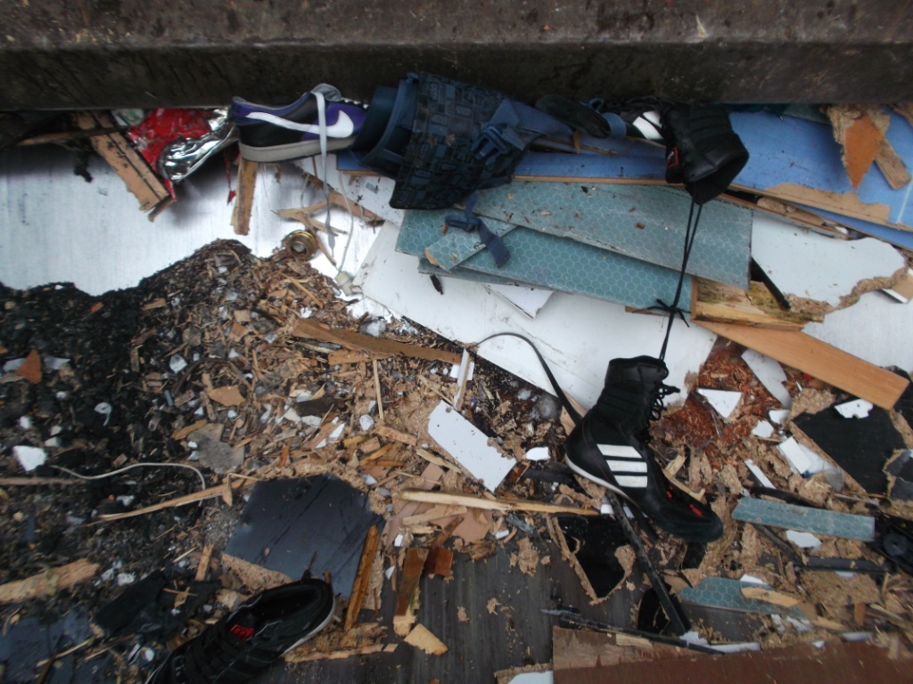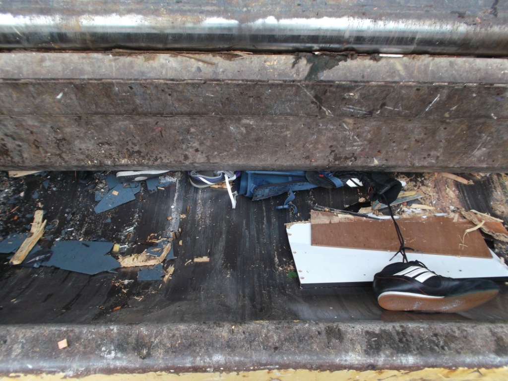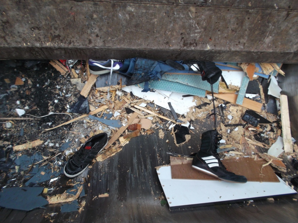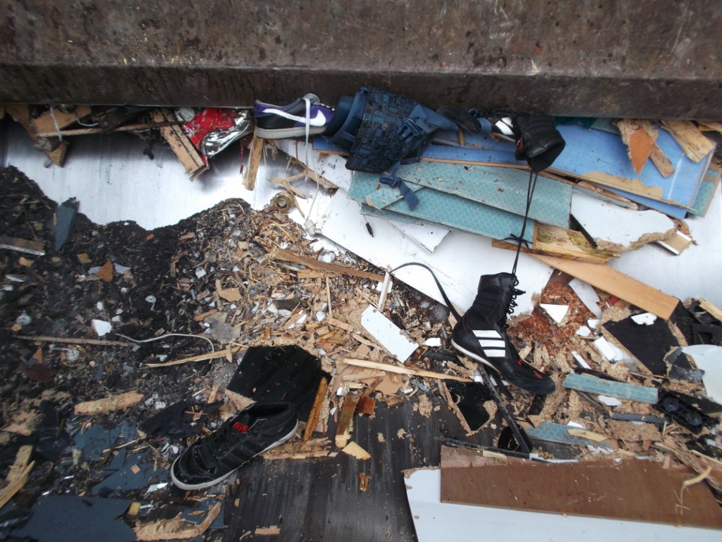Gleich würden diese Stiefel böse leiden müssen. Glassplitter, viel hartes Holz und eine Presse, die den ganzen Dreck in ein schon fast volles Auto reinpressen muss. Das ist absolut tödlich!