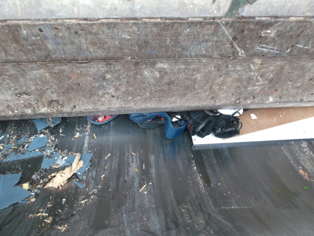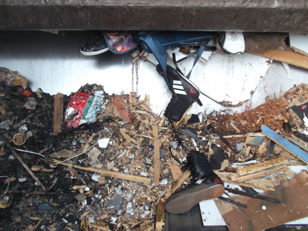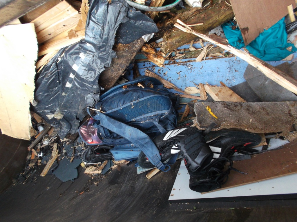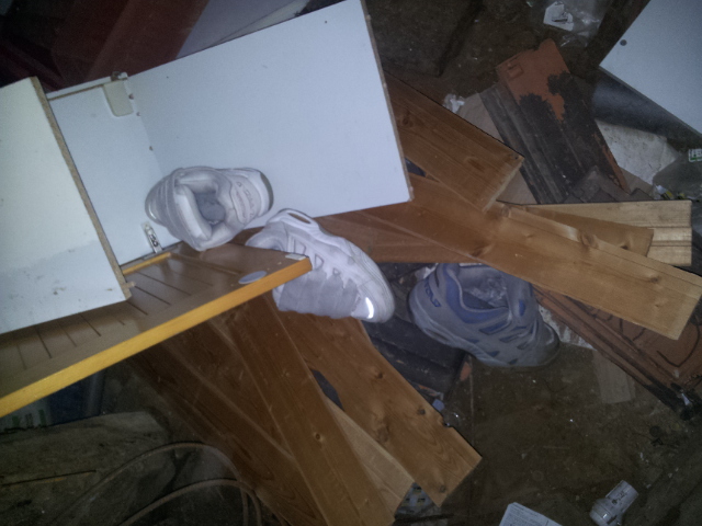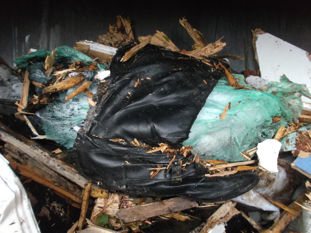 Gleich würden diese Stiefel böse leiden müssen. Glassplitter, viel hartes Holz und eine Presse, die den ganzen Dreck in ein schon fast volles Auto reinpressen muss. Das ist absolut tödlich!