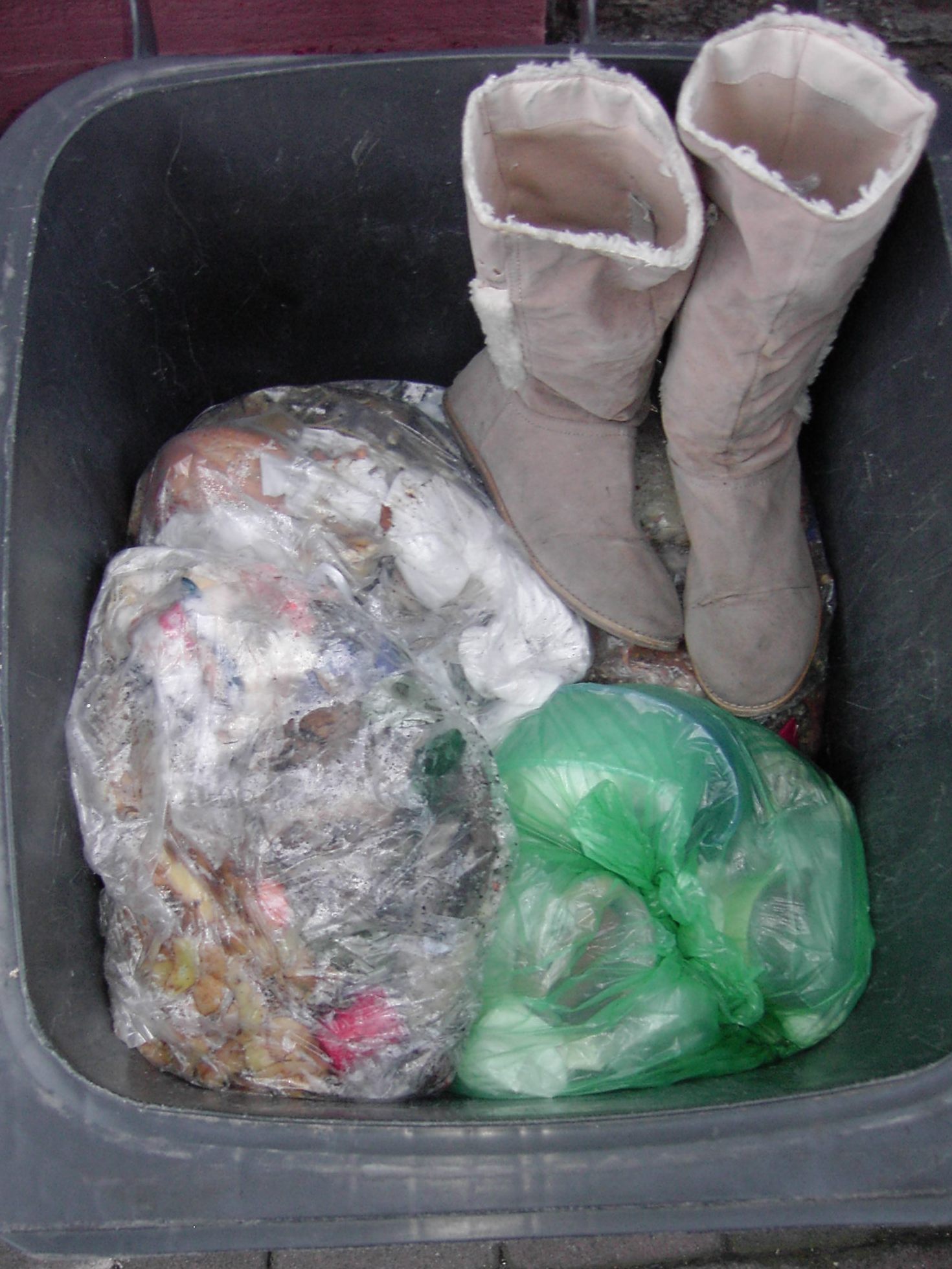 Tamaras nun endgültig ausrangierte Winterstiefelchen von "Björndal". Ungespitzt stopfte Tamara die in die Mülltonne und den fetten Küchenmüllbeutel gleich drauf.