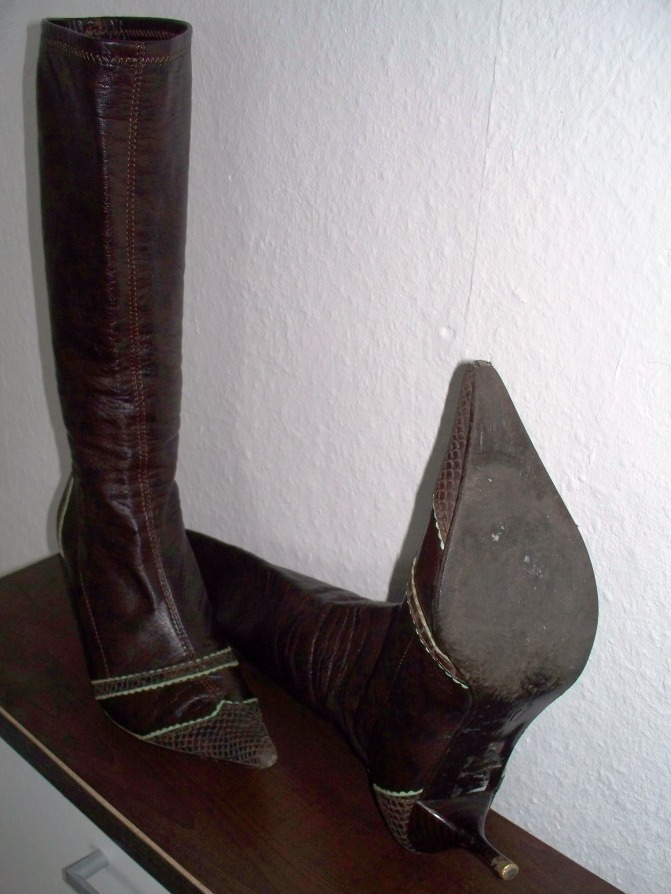 mit deinem Stiefelangebot, hast du meinen Geschmack troffen. Die braunen Stiefel passen in mein Beuteschema; einigermaßen spitze Form, schöne nicht alltägliche Applikationen, Pfennigabsatz -also genau richtig.
