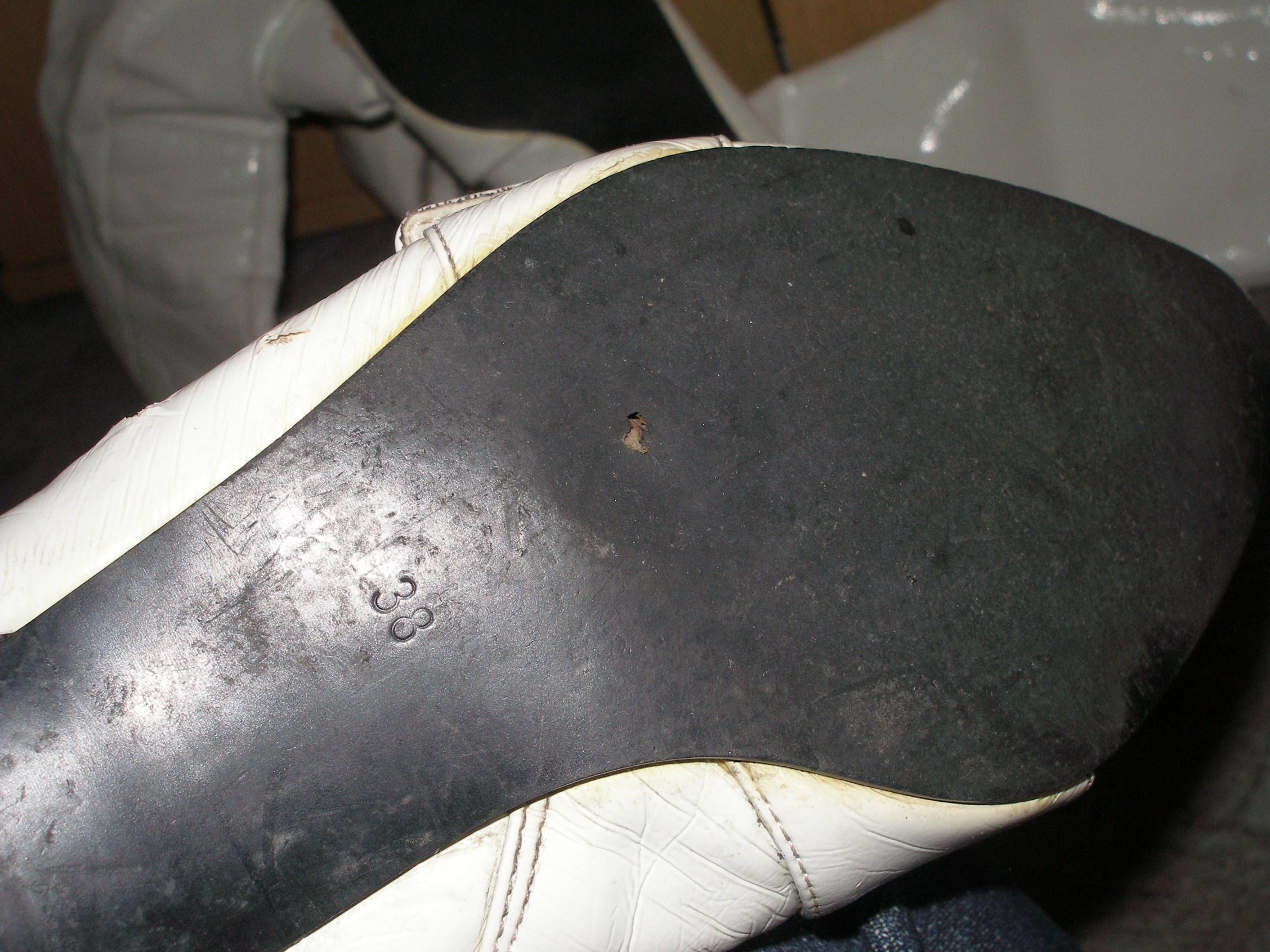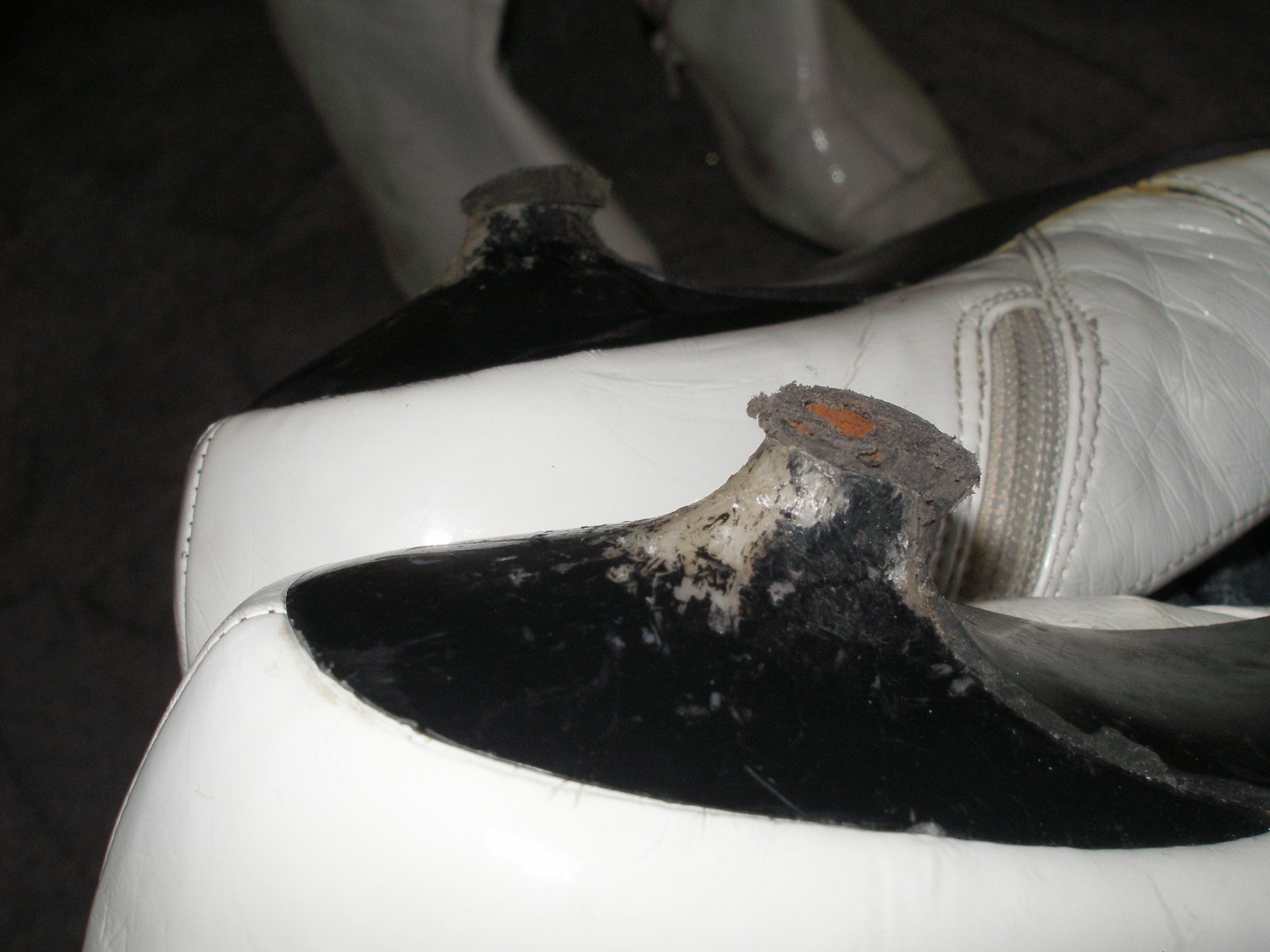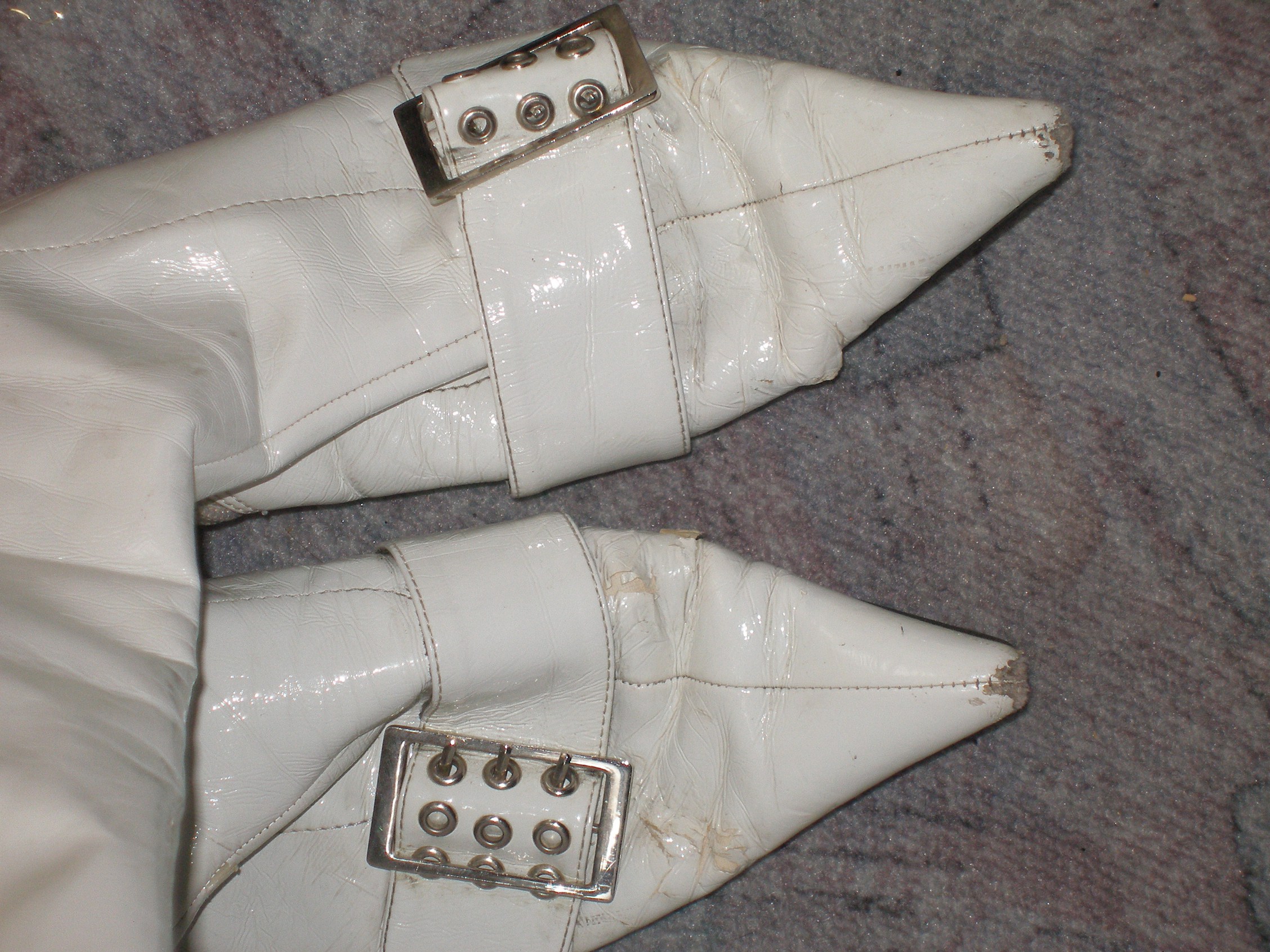 Bei den weißen Lackstiefeln mit dem Kittenheel geht buchstäblich der Lack ab und eine Reparatur ist fast unmöglich. Da selbst ich besser erhaltene ähnliche Modelle auf Lager habe, kann ich nur eines empfehlen: Ein letztes Abenteuer im Müll!