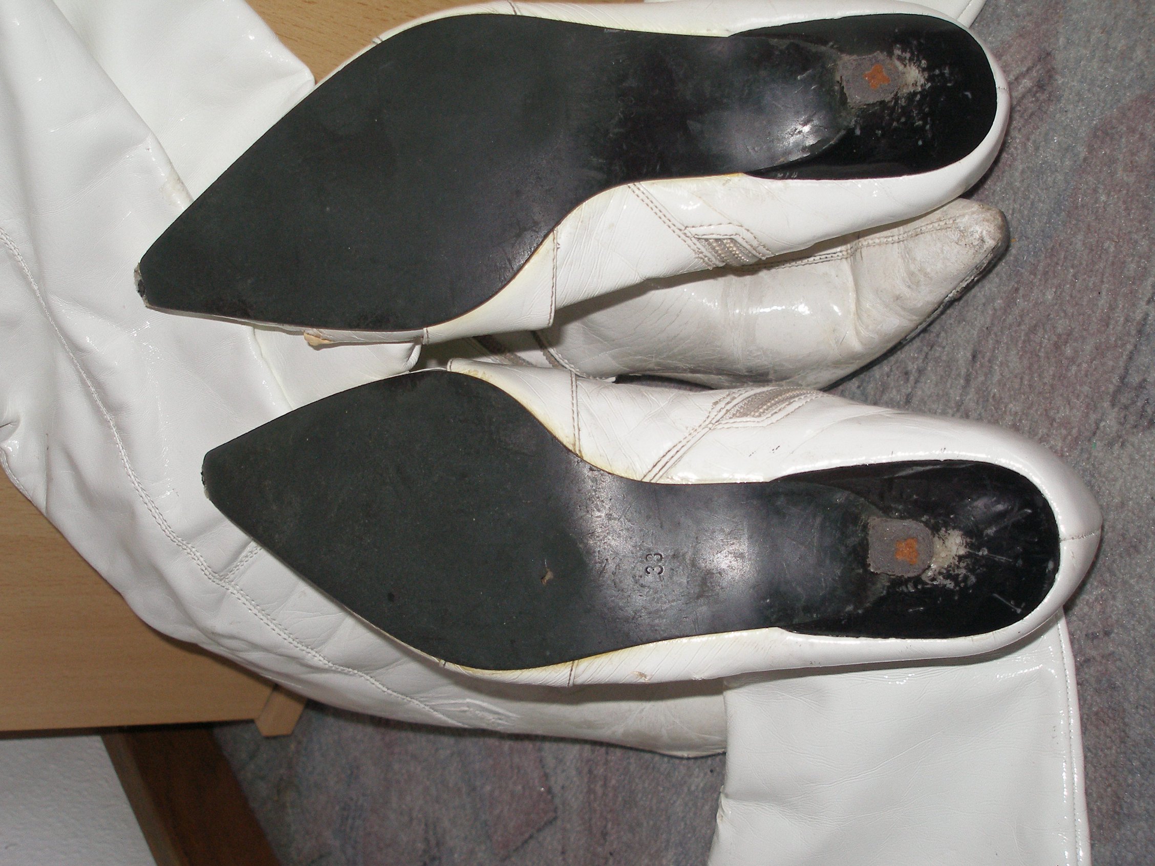 Bei den weißen Lackstiefeln mit den abgestöckelten Messing-Absatzplättchen fällt mir so wie bei den Pumps auf, dass da ein "Grobmotoriker" die mit weißer Schuhcreme eingesaut hat. Das würde richtig weh tun, wenn sie ansonsten noch ordentlich aussehen würden. Ich will ja keine Krokodilstränen vergießen, aber dieses Paar ist so richtig nuttig abgelatscht und die sehen so aus, als seien sie von einer ziemlich heruntergekommenen Bordsteinschwalbe abgelatscht worden. Ich frage mich wirklich, ob Pointy-Girl sich mit denen nochmal sehen lassen will. Ein fast ähnliches oder gar gleiches Paar habe ich auch auf Lager, allerdings meine ich, die wären Gr. 40 und derzeit von Anja im Beschlag genommen, obwohl sie auch bei ihr keine guten Zukunftsaussichten haben. Aber irgendwo habe ich sicher noch bessere und passende. Kurzum: Ich gebe es offen zu: Diese Stiefel sind endfertig, reif für den Müll und ich hätte die gerne für eine außergewöhnliche Aktion. Oh ja, diese Stiefel sind .... lechzzzzzzzz