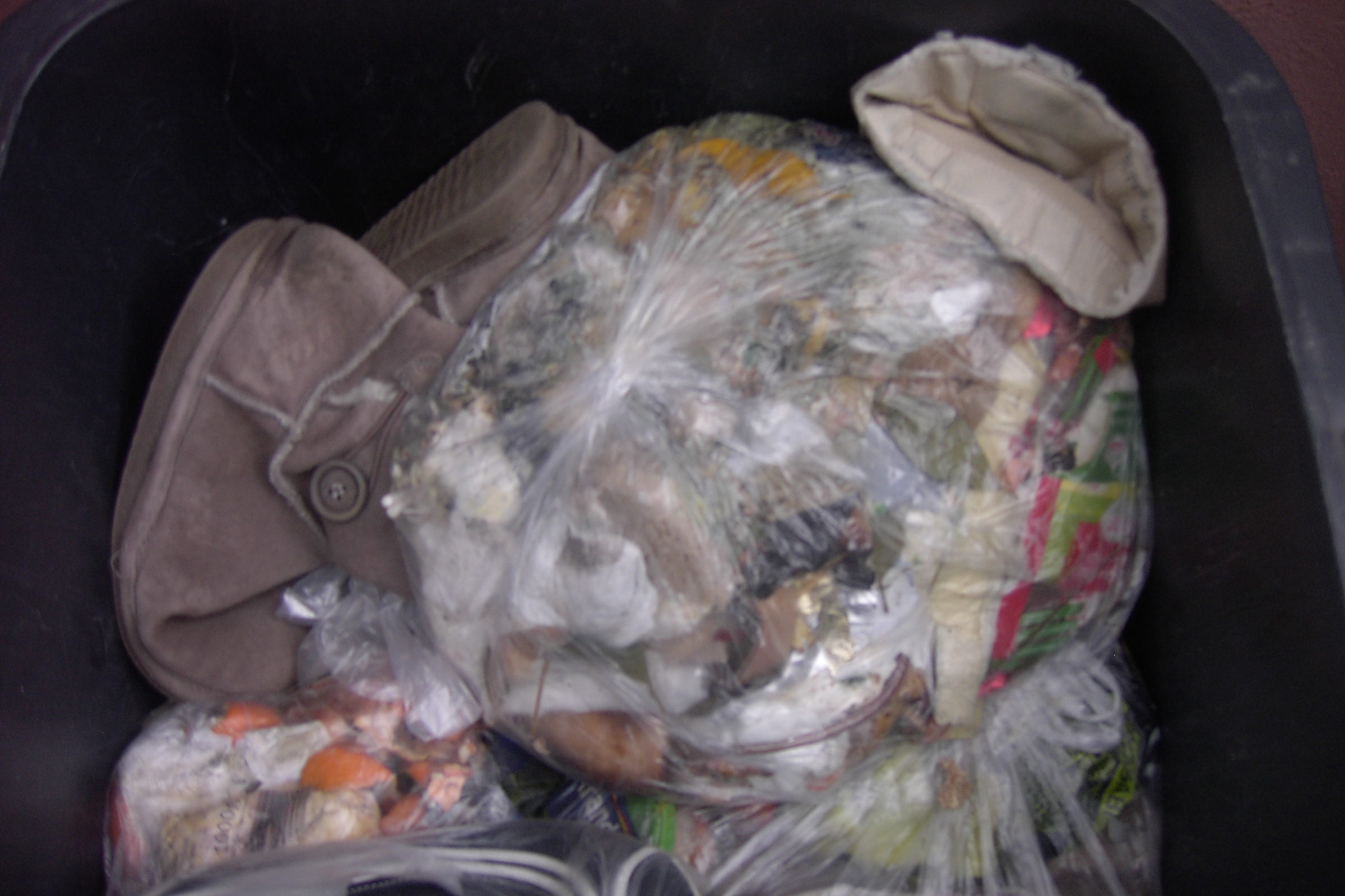 Noch schnell ne kaputte Fake-Handtasche im Müllbeutel in unsere Tonne gestopft.