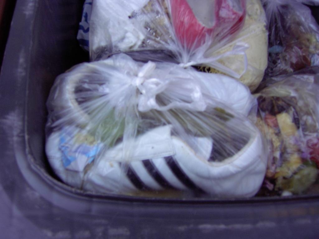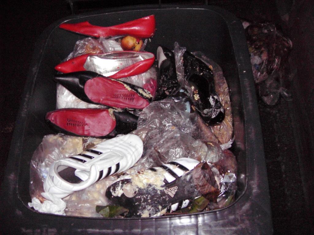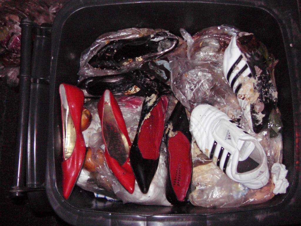 Gleich zwei Paar Pumps kamen zu Nudelresten und fauligem Obst in einen Müllbeutel.