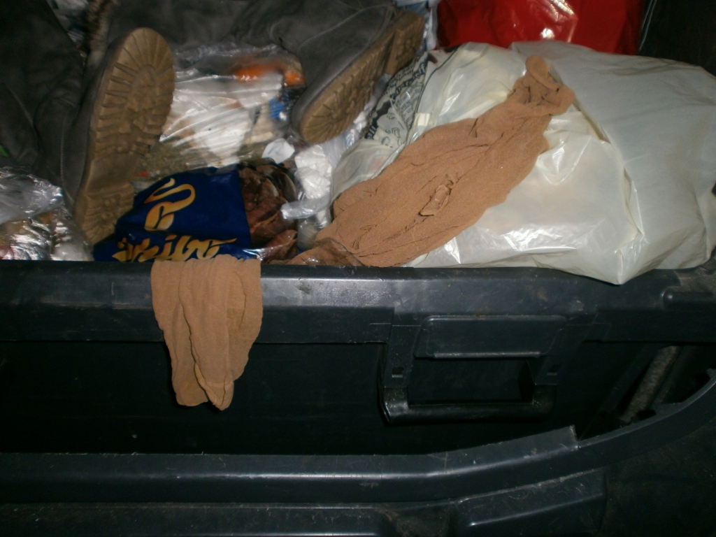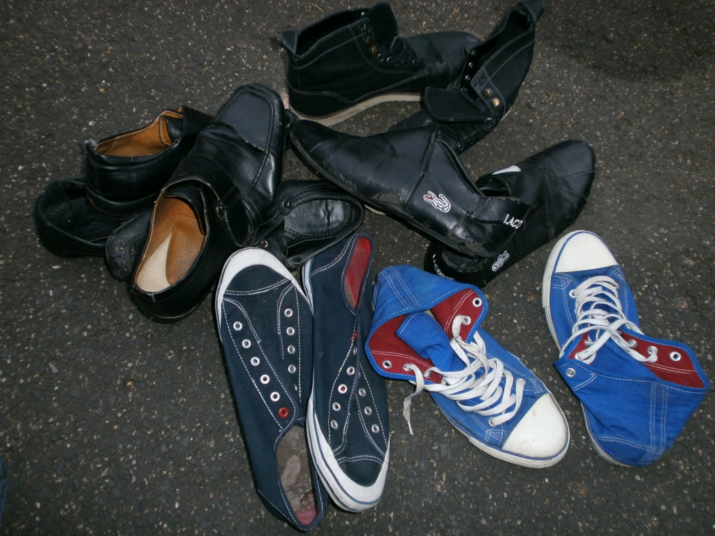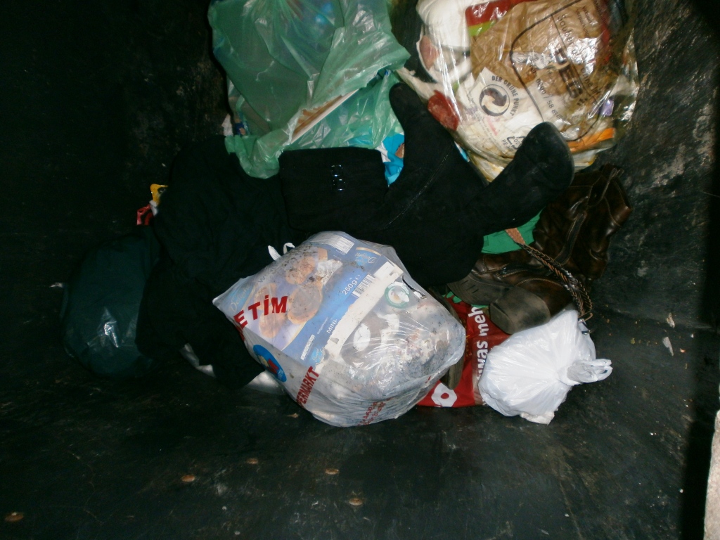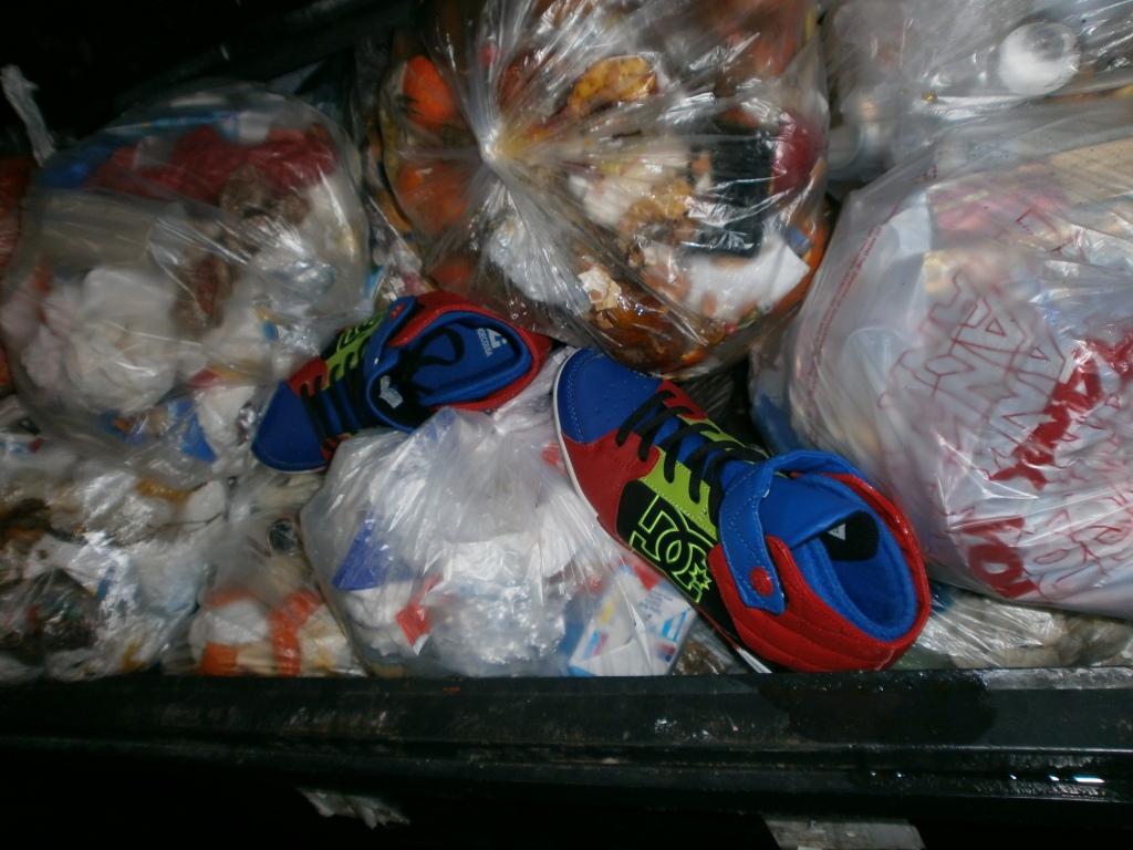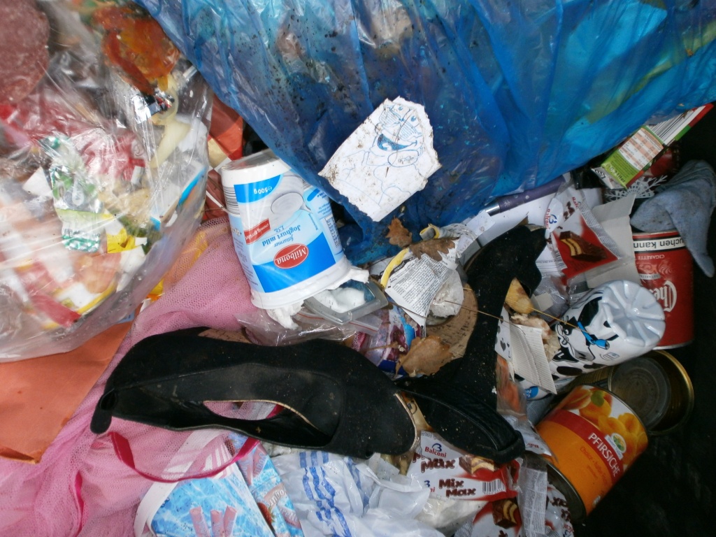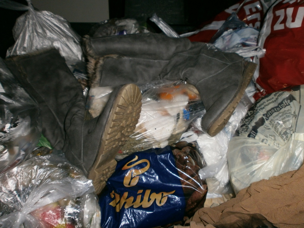 knapp eine Woche später habe ich eine weitere Mülltonnentour gemacht und diesmal habe ich richtig versiffte abgetragene Schuhe und Lumpen im Dreck der Müllcontainer gefunden: