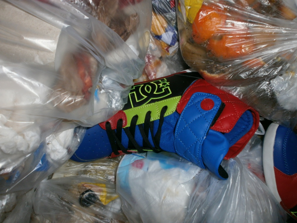Silvesterabfälle und noch kurz vor der Müllabfuhr die Sneakers oben drauf, damit sie mit "wegkommen".