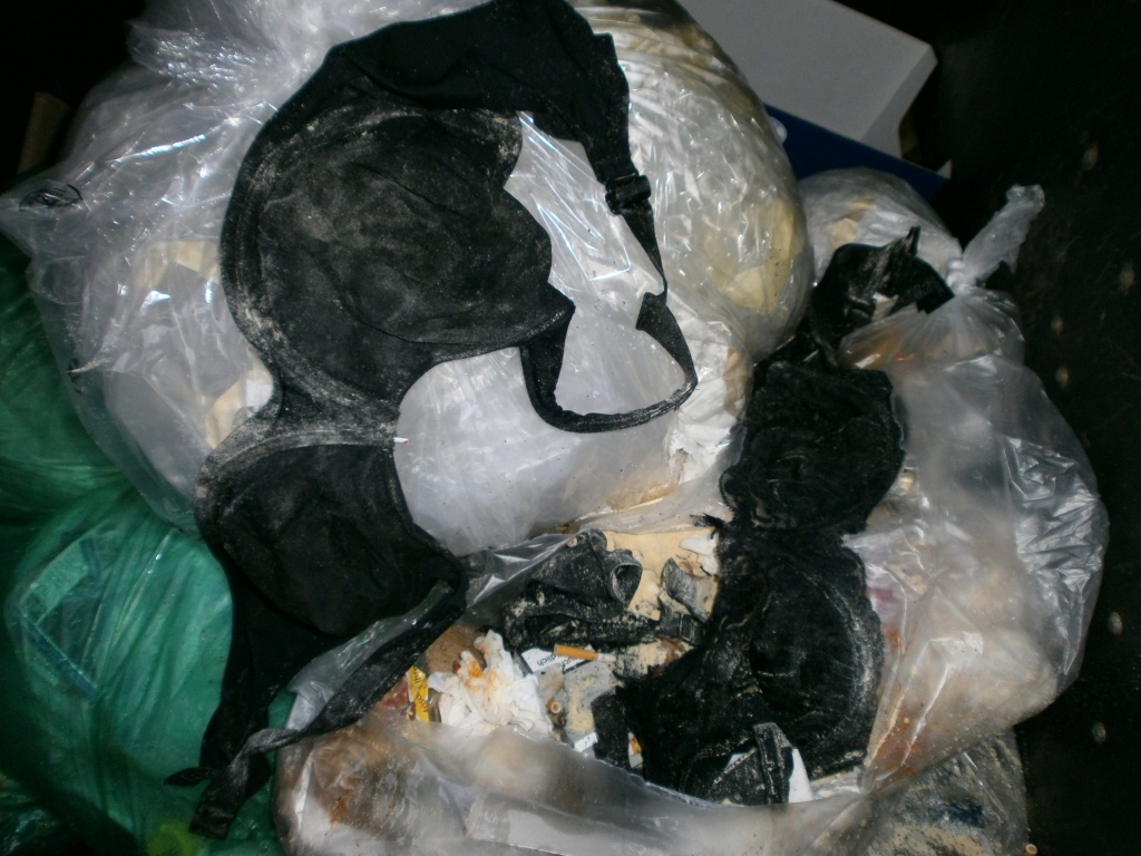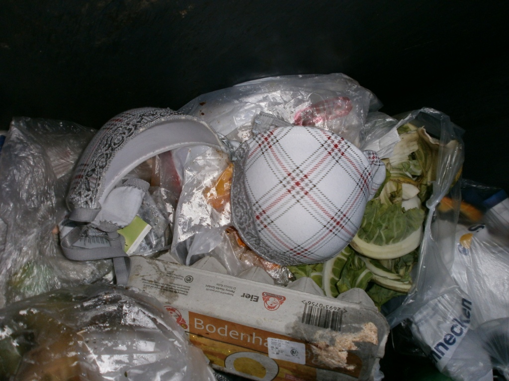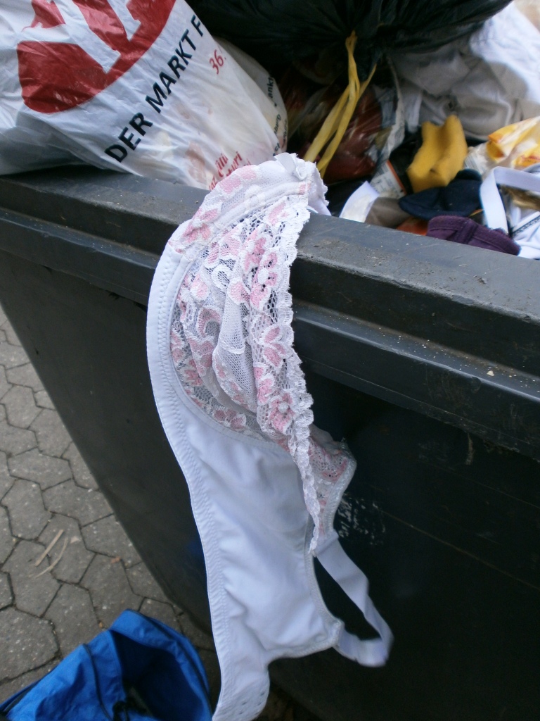 Ihr süßer noch sehr schöner BH (75 B) kullerte beim Wurf in den Müllcontainer an die Wandung und blieb ausgerechnet auf einem offenen siffigen Küchenmüllbeutel liegen!