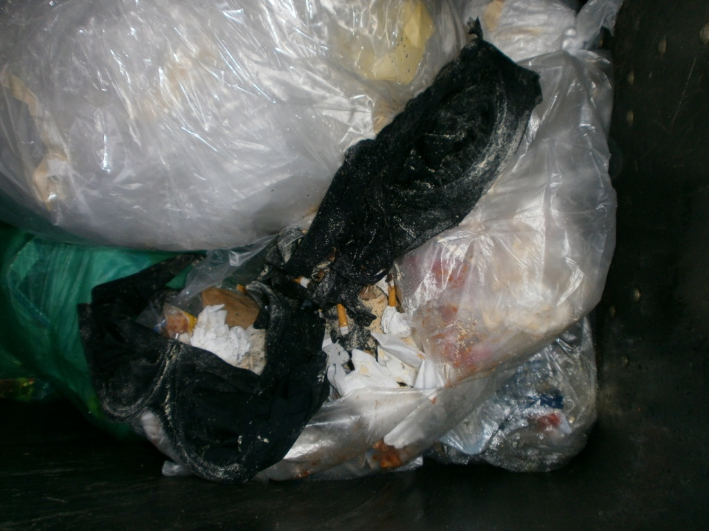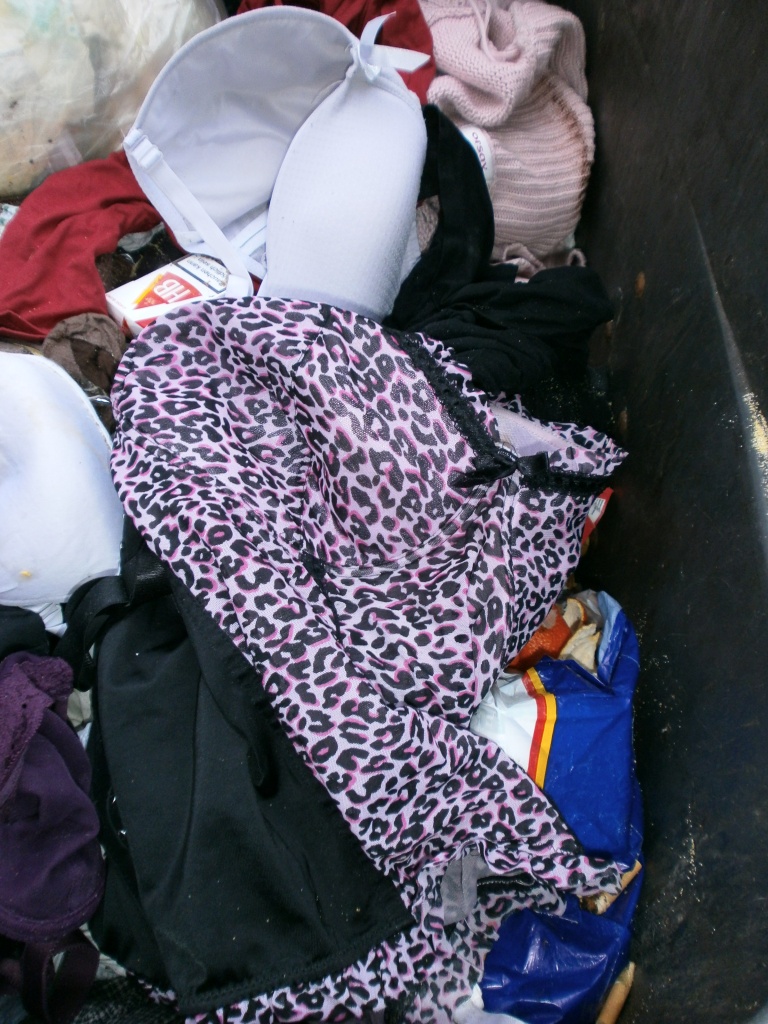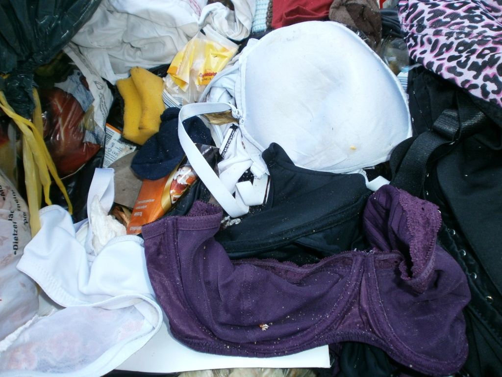 recht häufig kommen süße und sexy Wäschesachen in den Hausmüll. Spätestens auf der Mülldeponie ist kein Teil mehr sauber und unbeschädigt. Aber der Anfang der "Müllkarriere" kann sauber oder schmutzig sein. Hier nun Lumpen aus zwei Müllcontainern gleichzeitig: