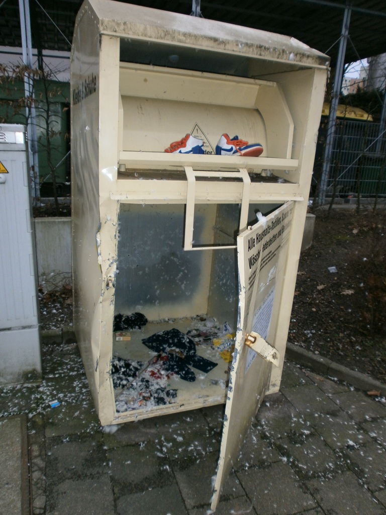zum Abschluss dieser Mülltonnentour fiel mir ein geknackter Altkleidercontainer auf. Das war ein wüstes Bild. Als ob nichts passiert wäre, hat jemand ein Paar Nikes dort entsorgen wollen. Es ergab sich ein skurriles Bild: