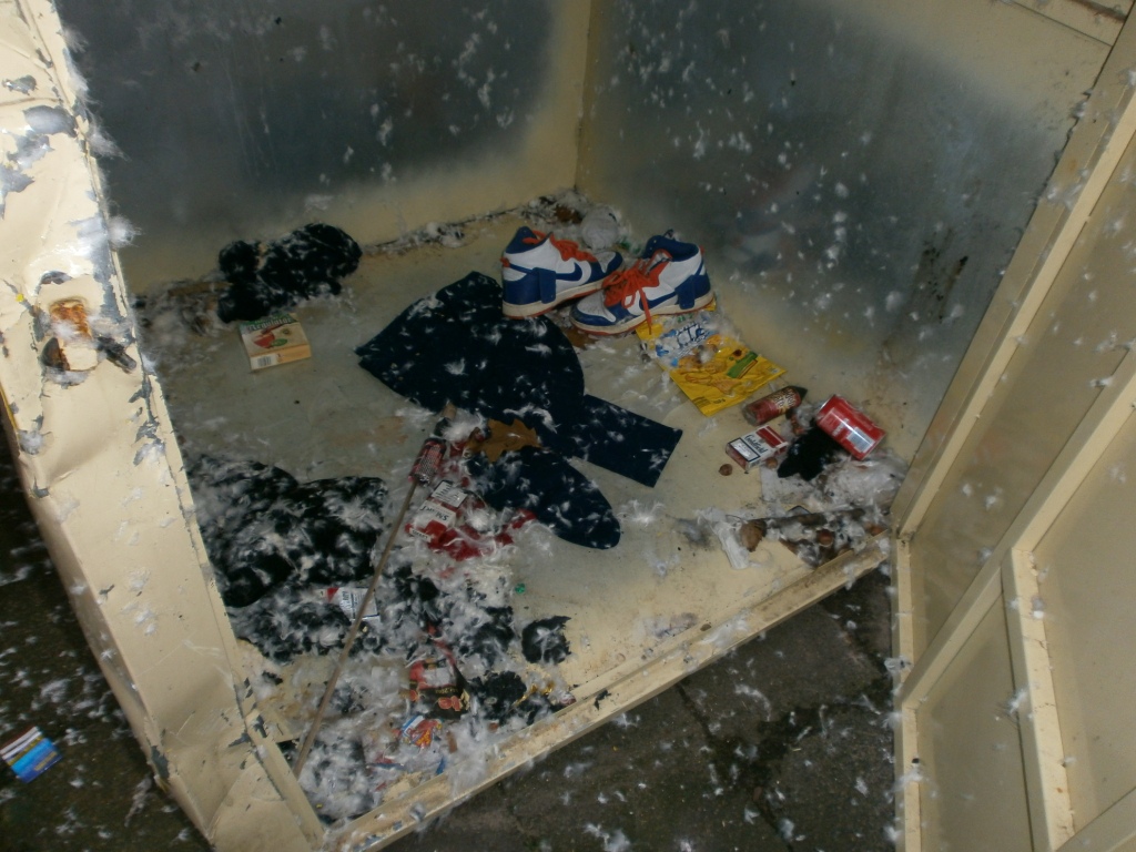 Die ganze abgetragene Wäsche verdreckt und versaut, denn ein paar offene Mülltüten hatten schon ihren Dreck über die Lumpen verteilt.