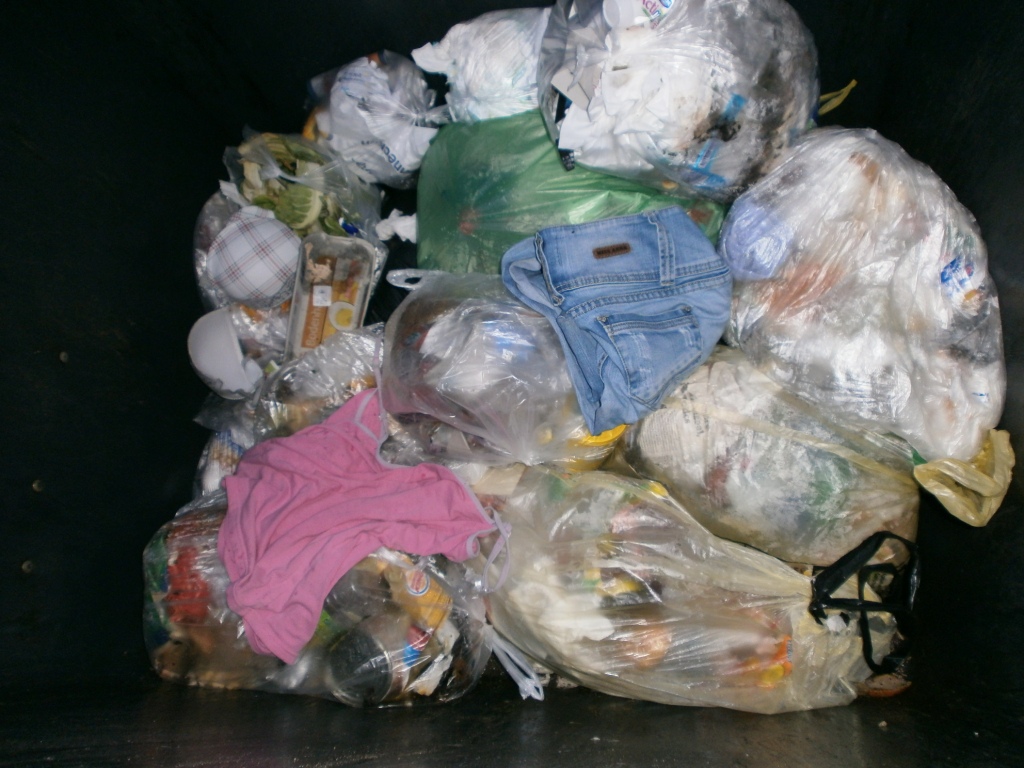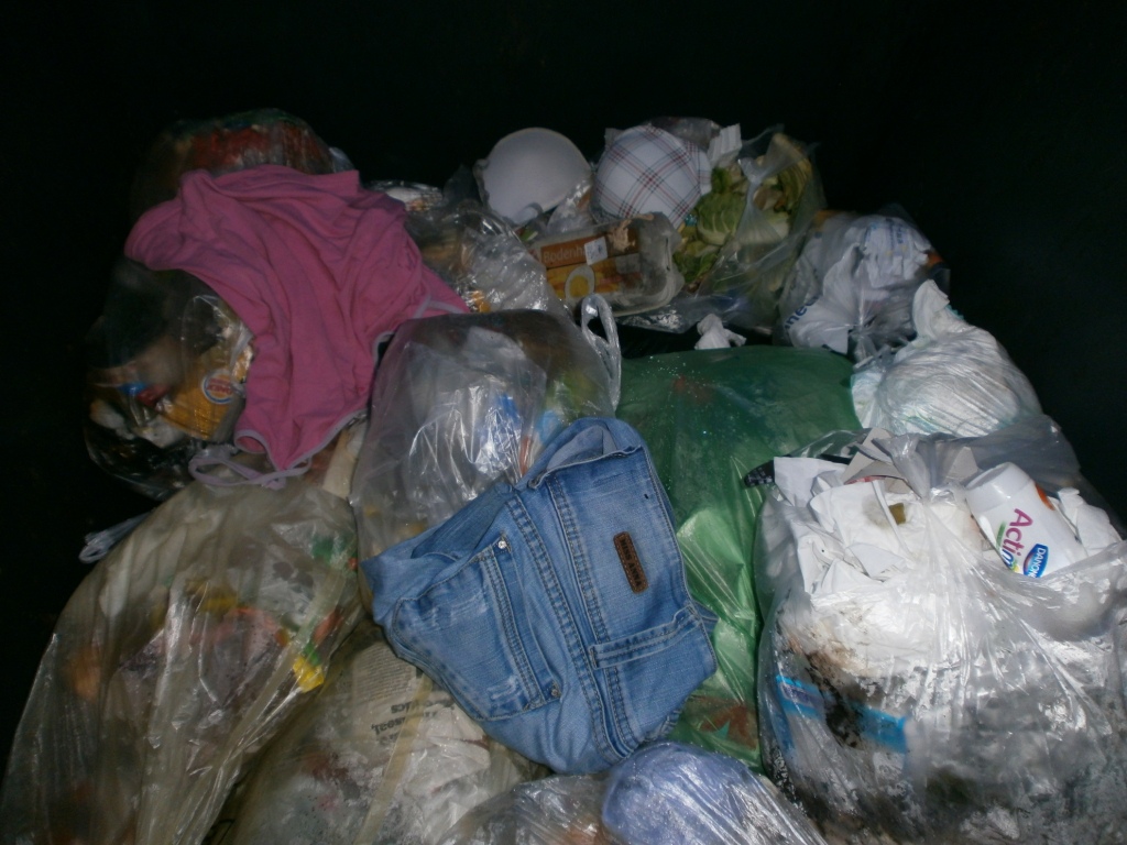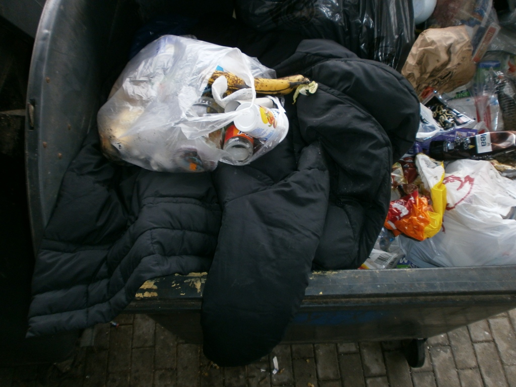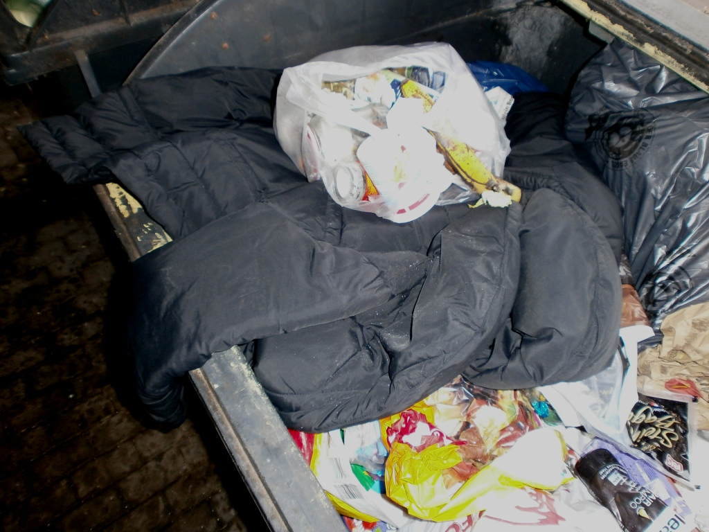 Da hat wohl das Mädel seine ausrangierte Winterjacke mit einem lässigen Wurf in den Müllcontainer geschmissen und (ihren?) Küchenmüllbeutel gleich mit drauf?!