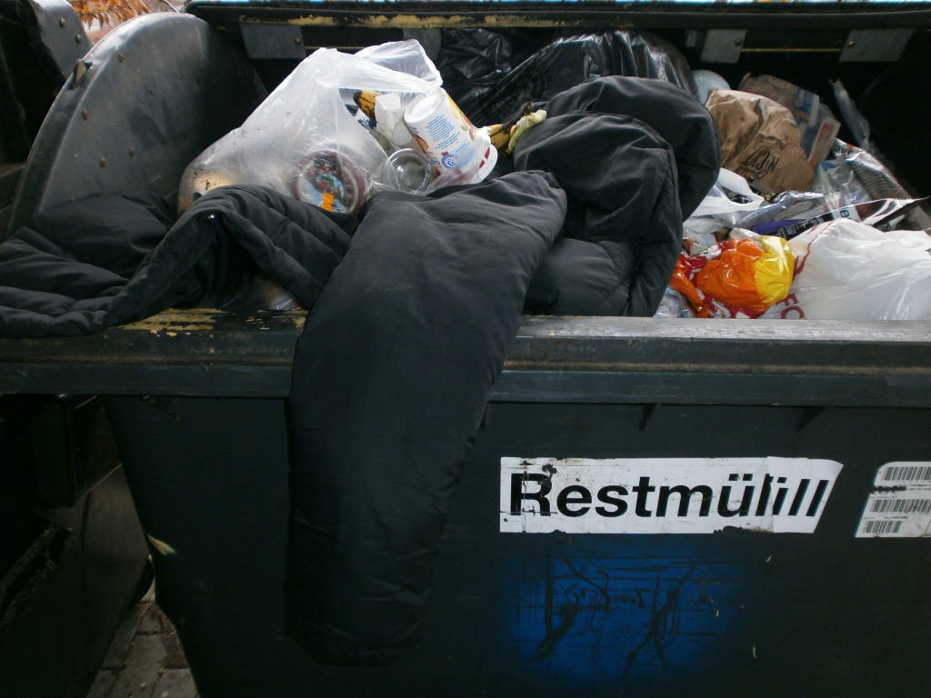 Wären da noch weitere fette Mülltüten drauf geworfen worden, dann wäre die Jacke wie der ganze andere Abfall auch durchs Müllgewicht tiefer in den Container gesackt und auch der Ärmel hätte wohl nicht mehr rausgehangen.