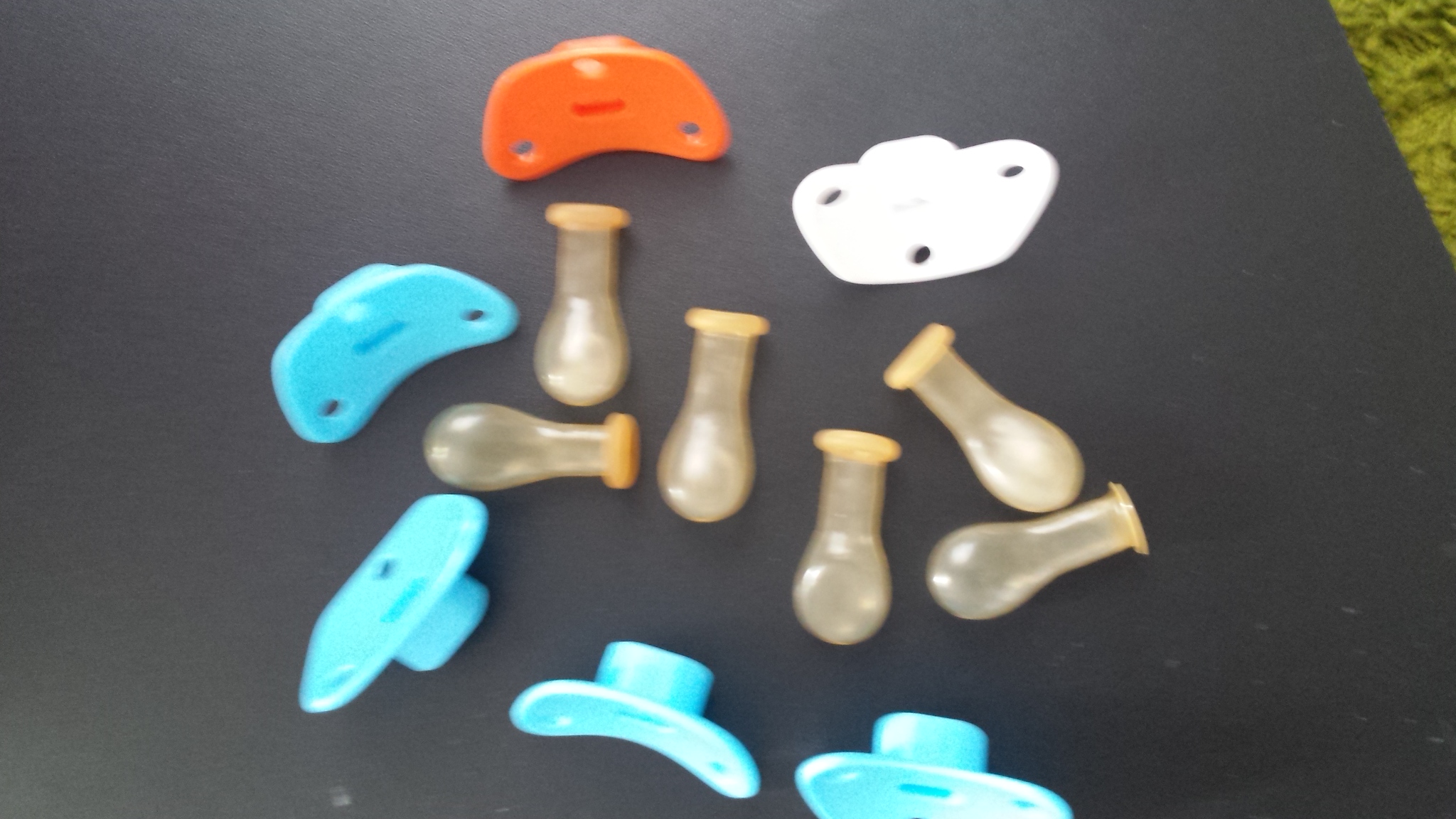 Neue Packung Schnuller auf den Rasen legen und mit Rasenmäher (anfangs höher gestellt) drüber fahren.