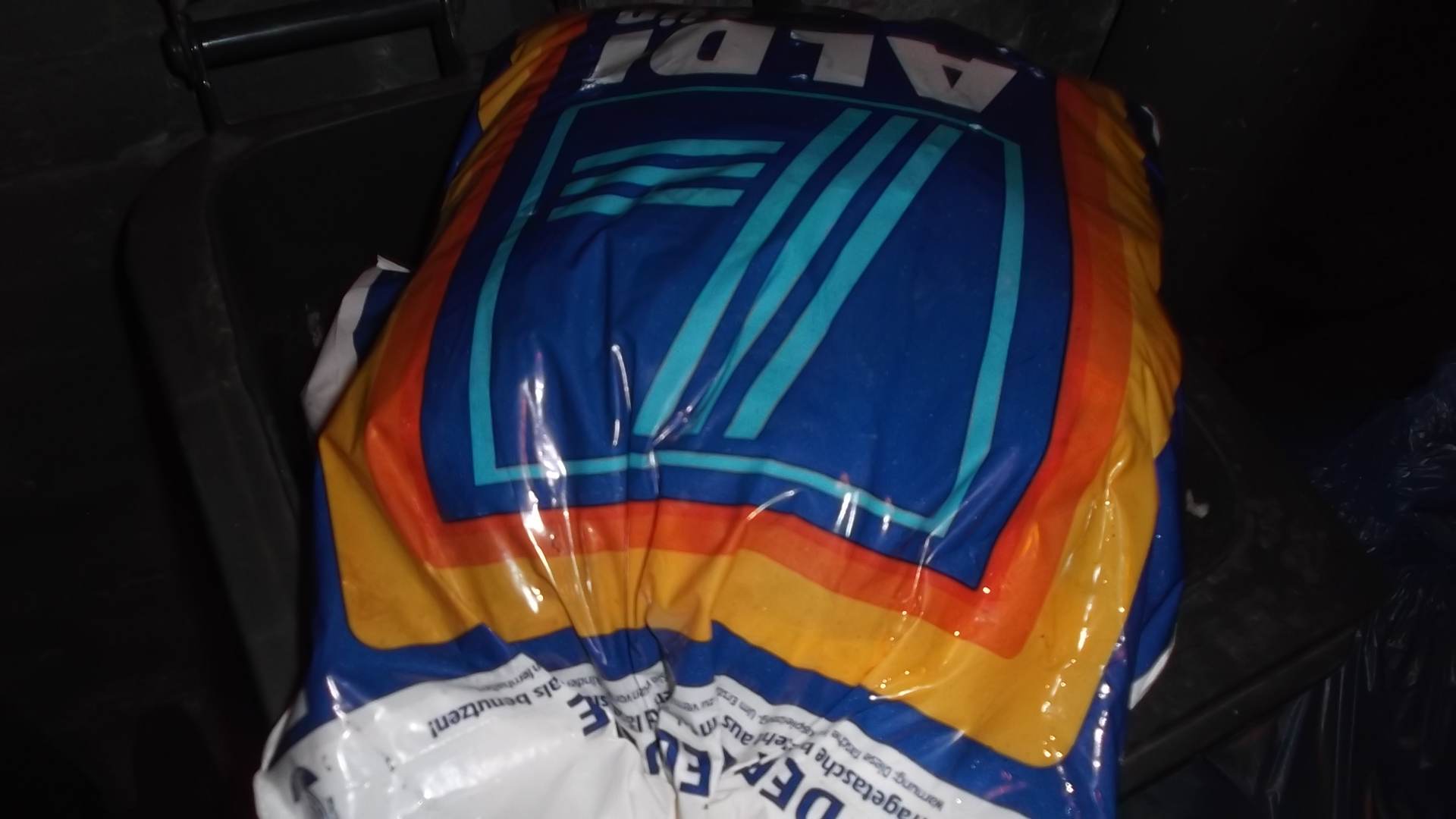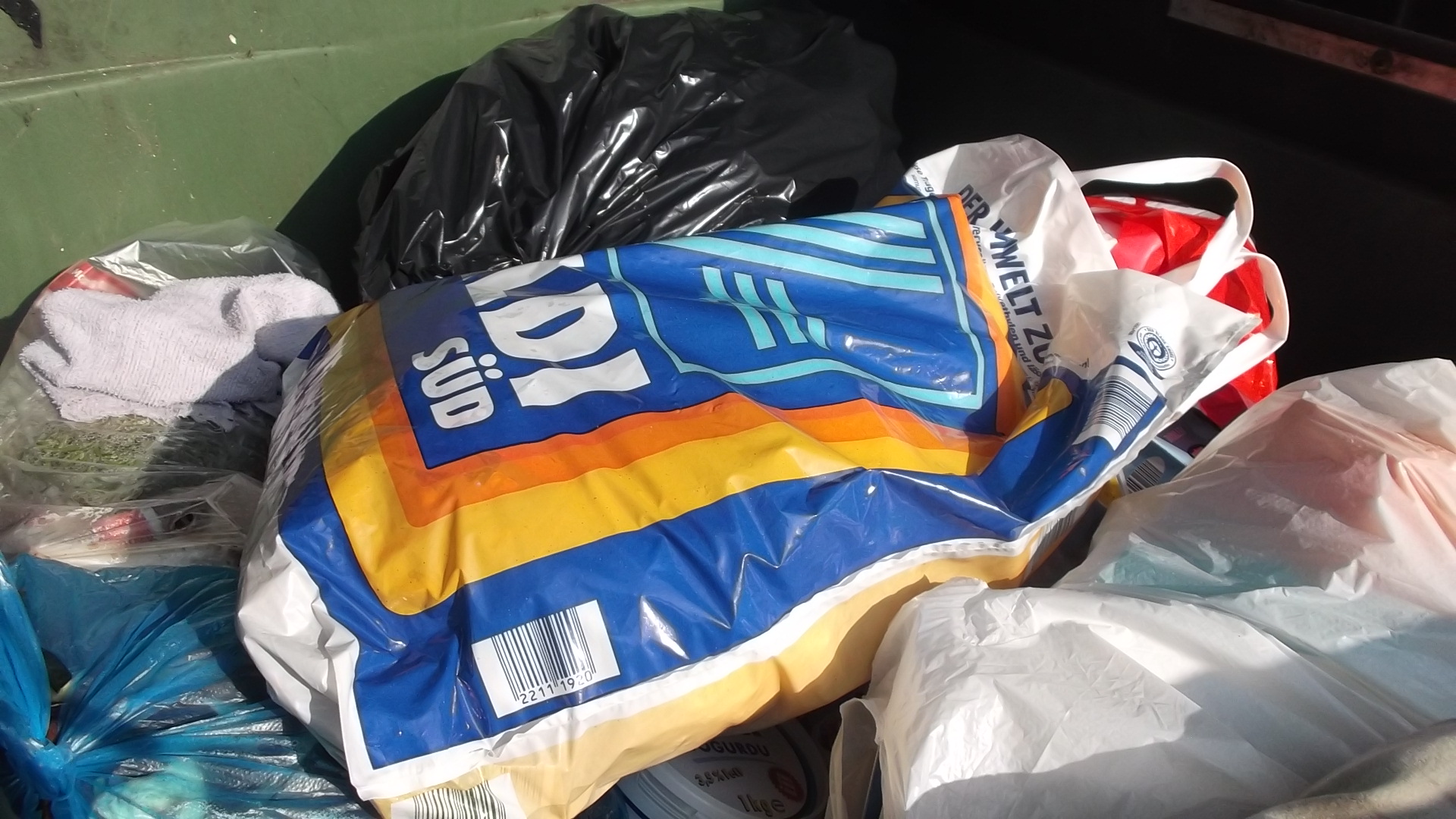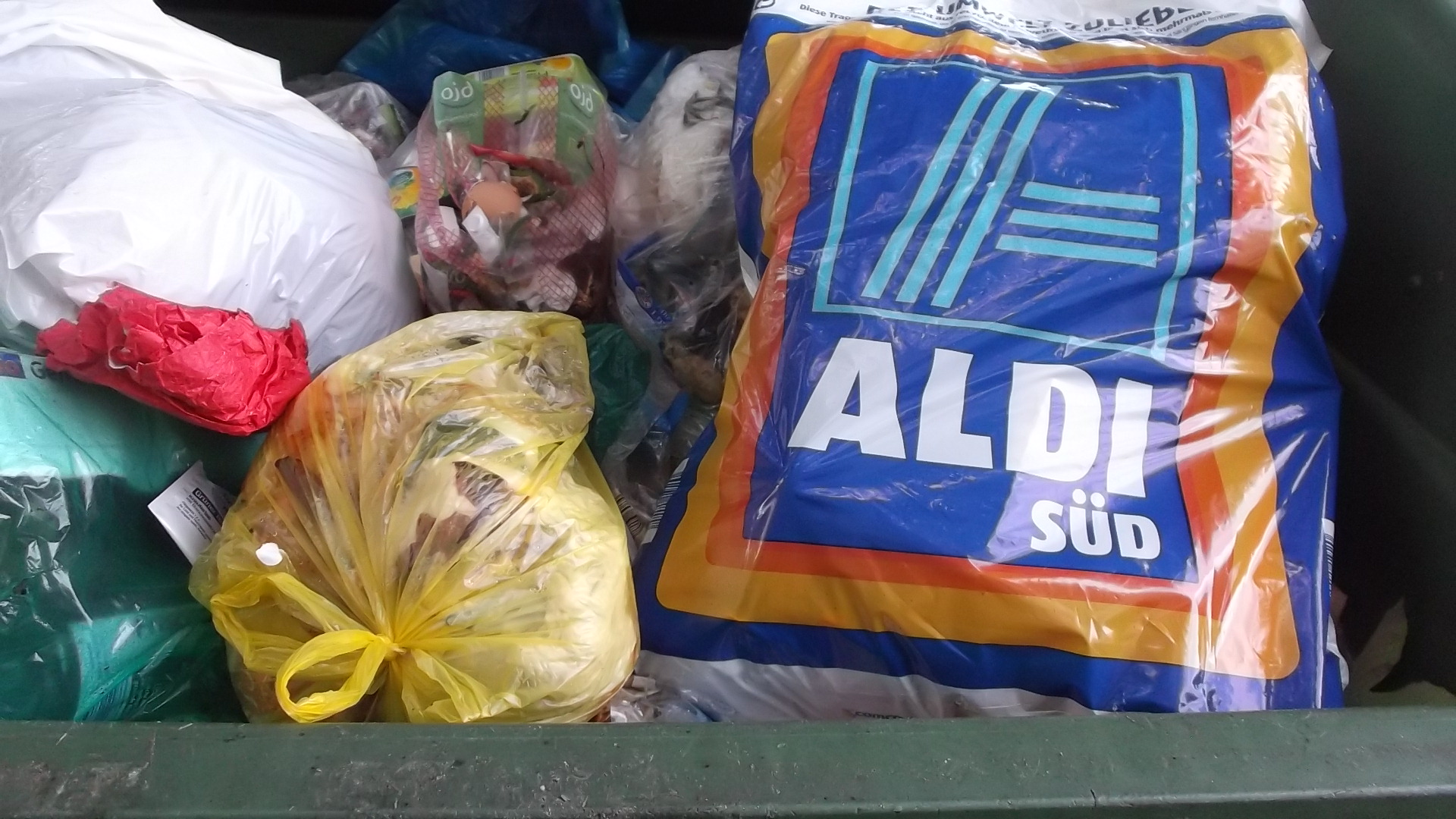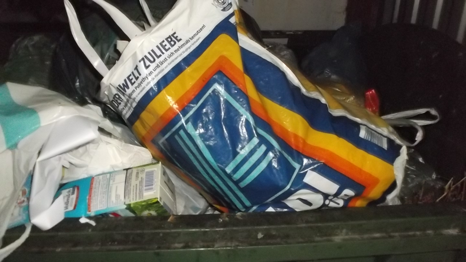 ein hausmüllcontainer...prall voll mit aldi-plastiktüten....alles ab ins feuer...