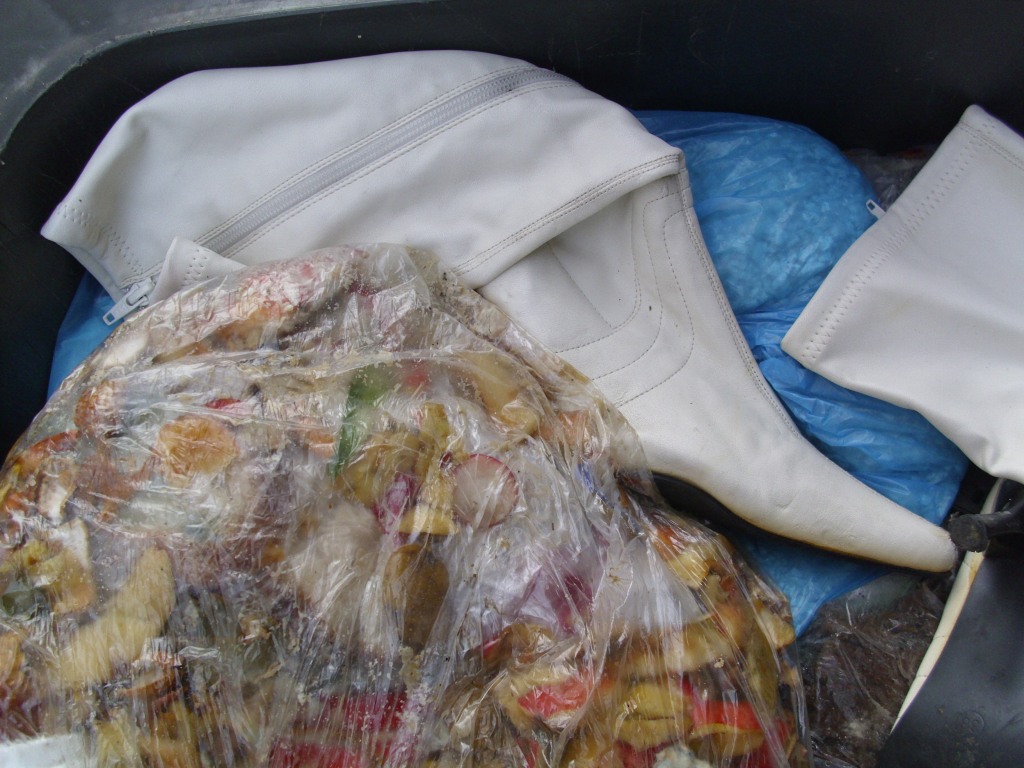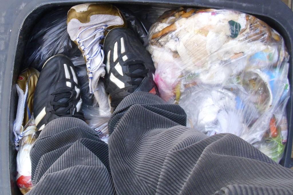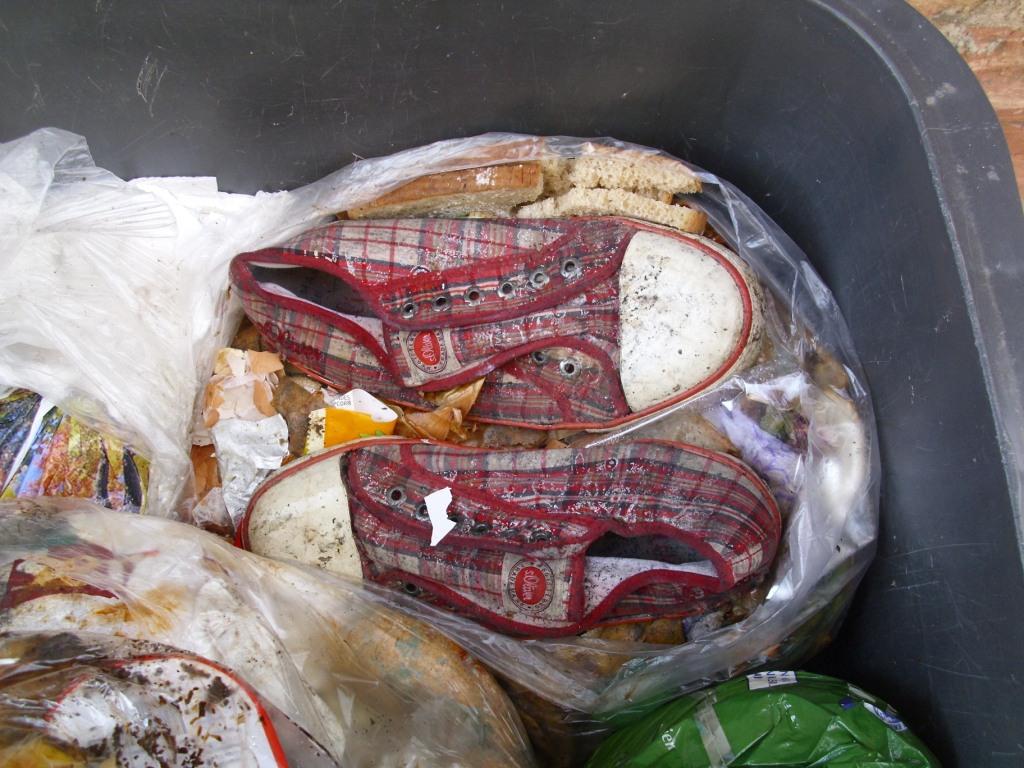 Manchmal muss sogar Marco (oder ich) seine alten Fußballschuhe mit Stollen für den besseren Grip im matschigen Müll anziehen, und den ganzen Dreck platt treten. Die Stollen graben sich dann fest und tief in beispielsweise weich gelatschtes Obermaterial von Müllschuhen und er tritt prall gefüllte Küchenmüllbeutel platt, die oft aufplatzen und bisher noch relativ saubere Klamotten und Schuhe kriegen dann den siffigen Rest(müll) ab.