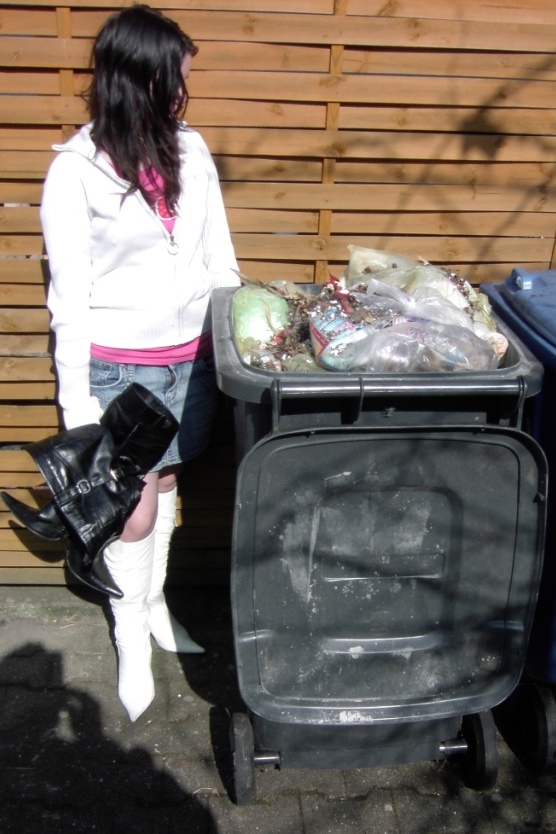 Dann kann es passieren, dass die erst abends in den Küchenmülleimer geworfenen Schuhe uns am nächsten Morgen traurig angucken und wir bilden uns ein, die vielleicht doch noch einmal zu tragen und sie werden "reentsorgt" und kommen wieder in den Schrank. Oder wir stellen die Schuhe auf den Mülltonnendeckel und hoffen, dass noch eine Frau sich ihrer erbarmt und sie mitnimmt, bevor die Müllabfuhr kommt. Es kann aber auch sein, dass eine Frau ein ganz besonders geliebtes Paar mit vielen Erinnerungen hat, welches sie nun loswerden will / muss. Das ist dann eine ganz verzwickte Kiste: Dann ist es oft sogar unser unabänderlicher Wille, dass die Schuhe vernichtet werden und die niemand anderes mehr in die Hände bekommt! Dann kippen wir Frauen möglicherweise Ekeldreck auf unsere alten Lieblinge oder wir geben sie persönlich einem Orangenen Engel in die Hände und sehen zu, wie sie im Pressmüllauto sterben. Das ist zwar ein echt schlimmer Anblick, aber dann können wir beruhigt das Drama abschließen. Sicherlich stehe ich als Frau nicht allein hinter den Gardinen und sehe schluckend mit zu, wie gerade die Mülltonne mit den Lieblingen drin geleert wird. Wenn dann das Müllauto wieder weg ist, fühlen wir uns ein wenig einsam.