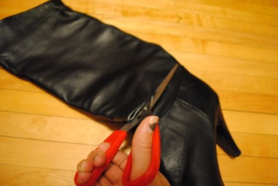 Das mal mit einem Paar Gummireitstiefel, die angezogen den Schaft vorne runter bis zu den Zehen aufgeschnitten werden...