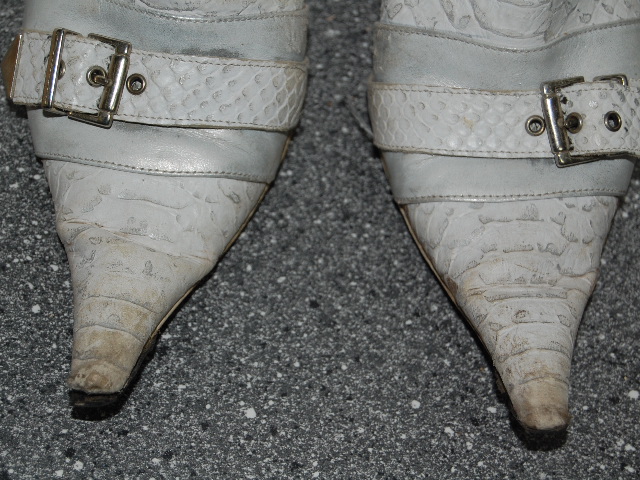 Soweit der Prolog. Der Prolog für ein Paar Designerstiefel der Extraklasse, die man nicht für 100 oder 200 Euro bekommen kann. Dieses Paar wurde von der Erstbesitzerin nur wenige Male getragen. Sie verfügte über mehr als 100 Paare. Und dieses Paar Stiefel wurde zu einem bestimmten Anlass angeschafft und danach nur noch Gelegentlich getragen. Die Abnutzungen an Sohlen und Absätzen bezeugten dies. Schließlich war das geprägte Sohlenprofil nur partiell abgelaufen und die Erstabsätze befanden sich noch in einem sehr akzeptablen Zustand.