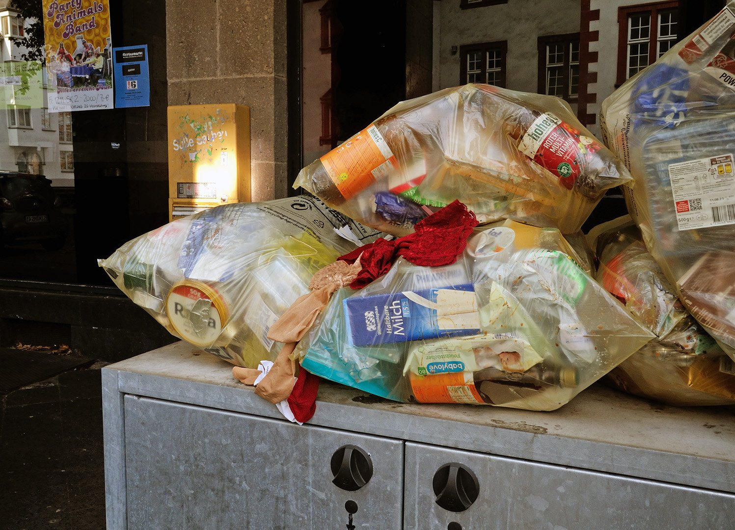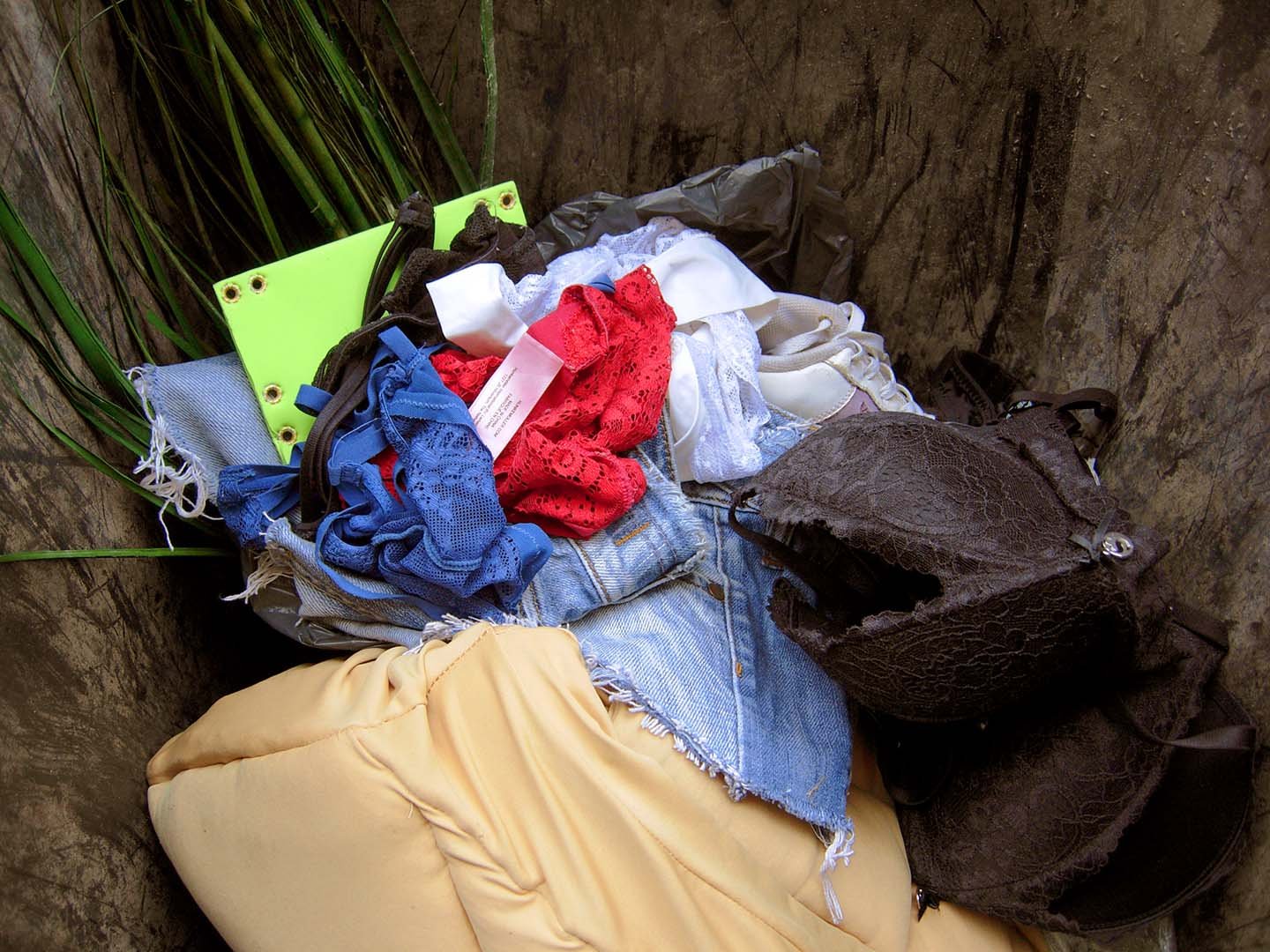 Zwei BH’S, vier Spitzenhöschen, sowie ein Paar Sneaker und diverse Klamotten warten auf die Müllabfuhr. Die BH’S und die Höschen waren völlig intakt und viel zu schade für die Müllverbrennungsanlage. Den Rest hat der Müllwagen verschlungen.