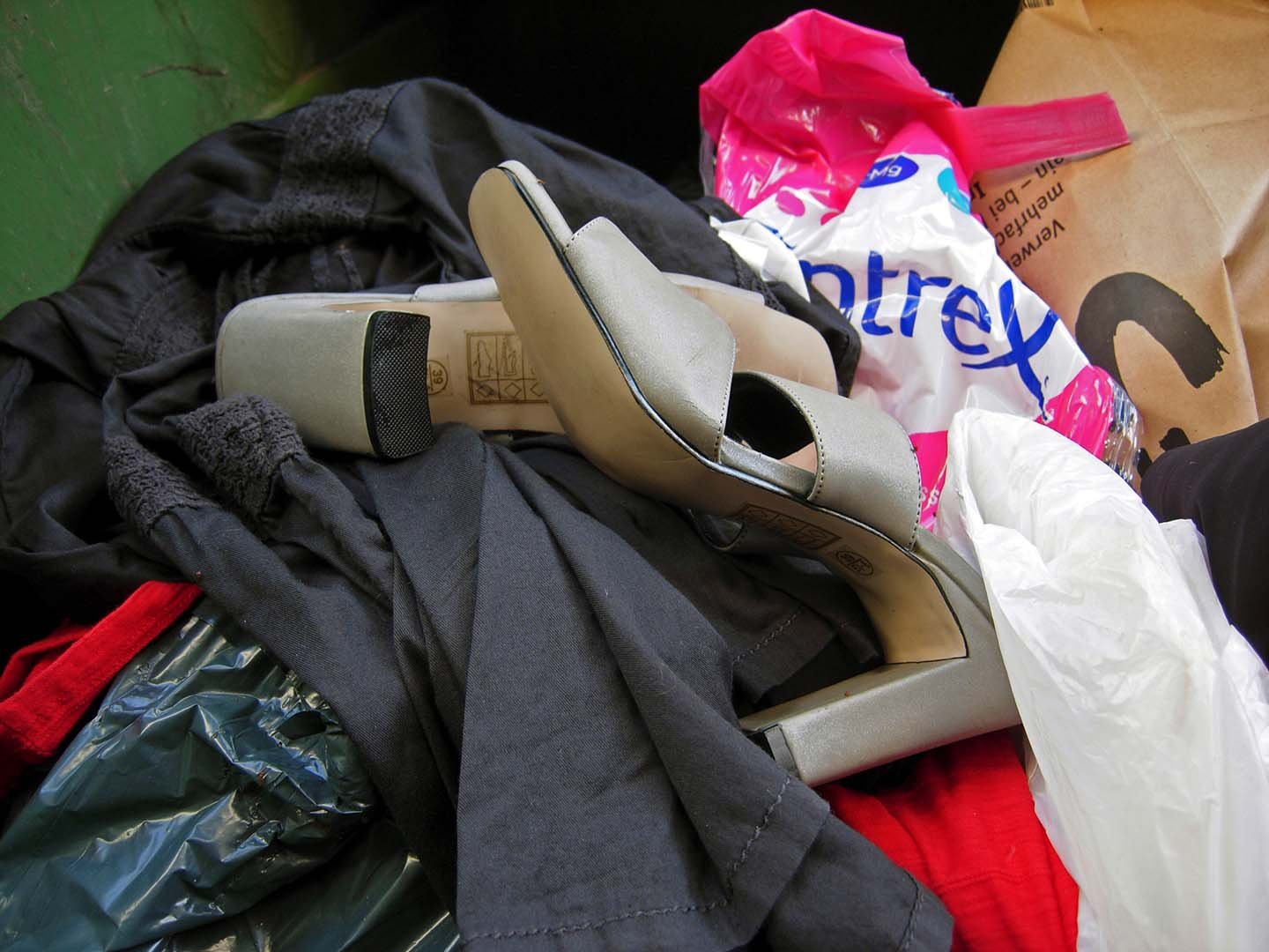 Ein Paar gut erhaltene Sandaletten, und ein Paar abgetragene Glitzer-Stoffschuhe, wenige Minuten vor ihrer letzten Reise im Müllwagen.